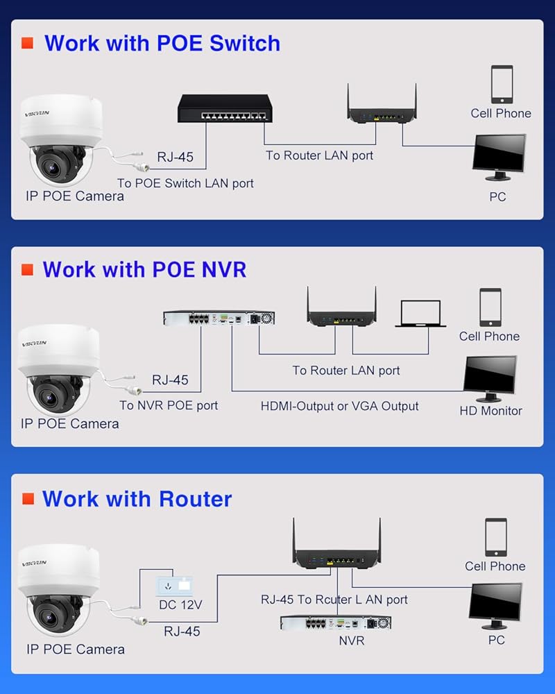 • سهولة تركيب كاميرا POE &P2P: من السهل إضافة الكاميرا عبر تطبيق AC18pro أو Videolink الذي يصل إلى تطبيق Apple أو متجر Google Play للتنزيل، لا يمكنك فقط الاستمتاع بالفيديو في الوقت الحقيقي واللعب والتقاط اللقطات وتلقي تنبيهات الحركة، ولكن أيضًا مشاركة الفيديو الحقيقي. فيديو زمني مع العائلة والأصدقاء؛ كاميرا POE لسهولة التركيب (مع كابل Cat 5 وCat 6)، كابل إيثرنت واحد فقط لتوصيل الطاقة والبيانات، قم بتوصيل حاقن PoE/المفتاح/NVR وسيتم تشغيله، وتبسيط التثبيت، وخفض الكابينة