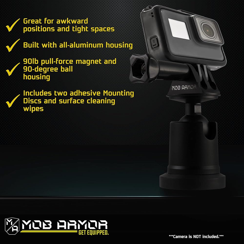 غطاء كروي بزاوية 90 درجة: يحتوي حامل الكاميرا المغناطيسي على غطاء كروي بزاوية 90 درجة يسمح لك بضبط زاوية الرؤية والتأكد من أن كاميرا جوبرو أو غيرها من كاميرات الحركة المتوافقة دائمًا في التركيز حتى في المساحات الصعبة والضيقة. المغناطيس قوي بما فيه الكفاية بحيث لا يسمح للكاميرا بالسقوط من أي زاوية.
