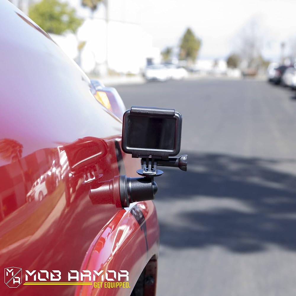 قوة سحب 90 باوند: يتميز الحامل المغناطيسي لكاميرا الحركة بقوة سحب 90 باوند ويمكن تثبيته بأي سطح معدني مثل السيارات والدراجات والقوارب. يأتي الحامل مع قرصين تثبيت لاصقين ومناديل تنظيف السطح للأسطح غير الحديدية مما يساعد على ضمان تثبيت آمن.