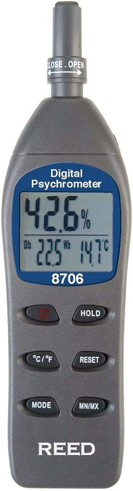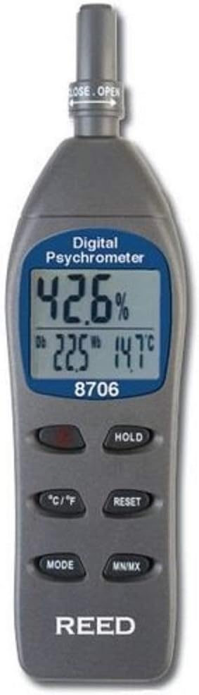This Digital Psychrometer provides simultaneous relative humidity and air temperature readings, as well as automatically calculating wet bulb and dew point temperatures without needing to consult charts. Simultaneous display of %RH, temperature and dew point or wet bulb. Optional external probe (87P6) for contact/differential temperature measurement. Max/Min/Avg readings. Data Hold Function. Low battery indicator and auto shut-off.