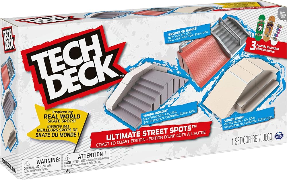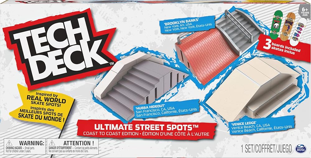 ارتقِ بلعبة تيك ديك إلى المستوى التالي مع مجموعة تيك ديك التيميت ستريت سبوتس! مستوحاة من أماكن التزلج في العالم الحقيقي، تتميز هذه التشكيلة الملحمية بـ 3 مواقع مميزة: بروكلين بانكس وهبا هايداوت وفينيس بيتش ليدج. بالإضافة إلى ذلك، يمكنك ضرب كل من هذه البقع بلوحة مختلفة! يوجد داخل هذه العبوة 3 ألواح أصابع فردية مجمعة بالكامل تتميز برسومات أصلية من شركات التزلج الحقيقية! قم بركوب القضبان في بروكلين بانكس، أو قم باستلقاء السلالم في مخبأ هابا، أو احصل على بعض الهواء الكبير في شاطئ فينيسيا! قم بتوصيل جميع الأماكن الثلاثة لإنشاء بقعة مثالية خاصة بك وقم بربط بعض الركضات المذهلة معًا! الخيارات لا حصر لها! أعد إنشاء حيلك المفضلة وقم بتوسيع مهاراتك من خلال الاطلاع على مقاطع الفيديو التعليمية عبر الإنترنت على techdeck.com. إذا كنت تريد أماكن حقيقية ورسومات تزلج حقيقية وشركات تزلج حقيقية، فيجب أن تكون تيك ديك! ابدأ صغيرًا، ثم انطلق بشكل كبير واجمعها كلها!