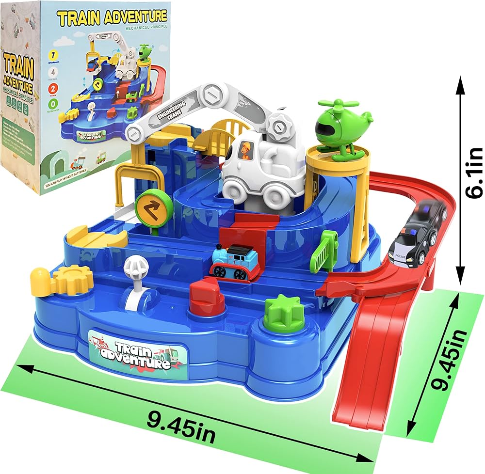 FUN KIDS TOYS: This car rescue adventure toy has a cool design, with 4 buttons to controlling and pass 7 different challenges, 4 mini toy vehicles includes 2 mini trains and 2 mini cars (police car, construction dump truck) for kids to play together. Built-in mechanical linkage track, inertial vehicle track, easy for installation, no batteries require.