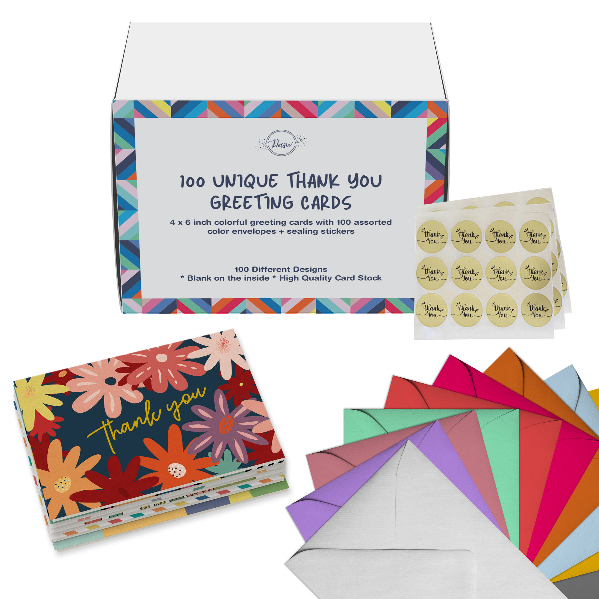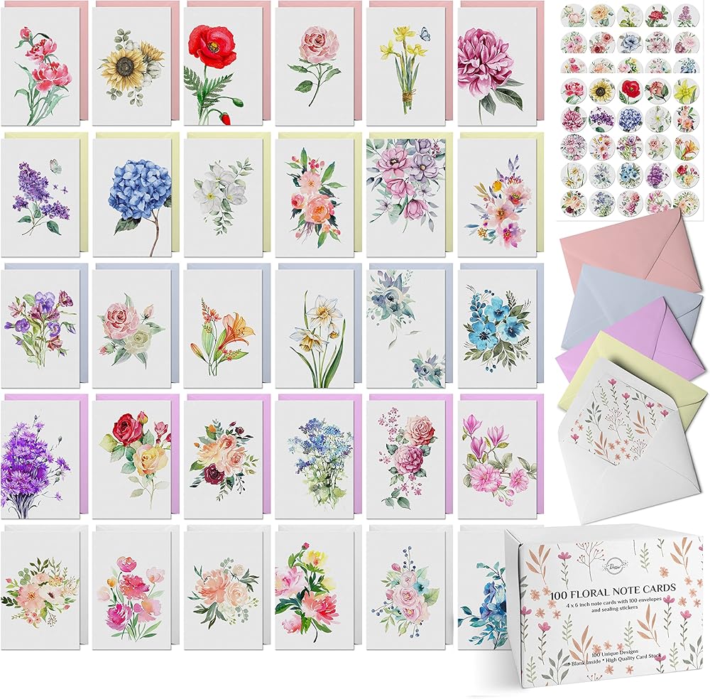 المجموعة المثالية لصناعة بطاقات الشكر الشخصية: 100 بطاقة مختلفة عالية الجودة بتصميمات جميلة ونابضة بالحياة؛ 100 ظرف بألوان متنوعة عالية الجودة؛ 100 ملصق ختم ذهبي "شكرًا لك" - لا تحتاج إلى أي شيء آخر لصنع بطاقة شكر مثالية!