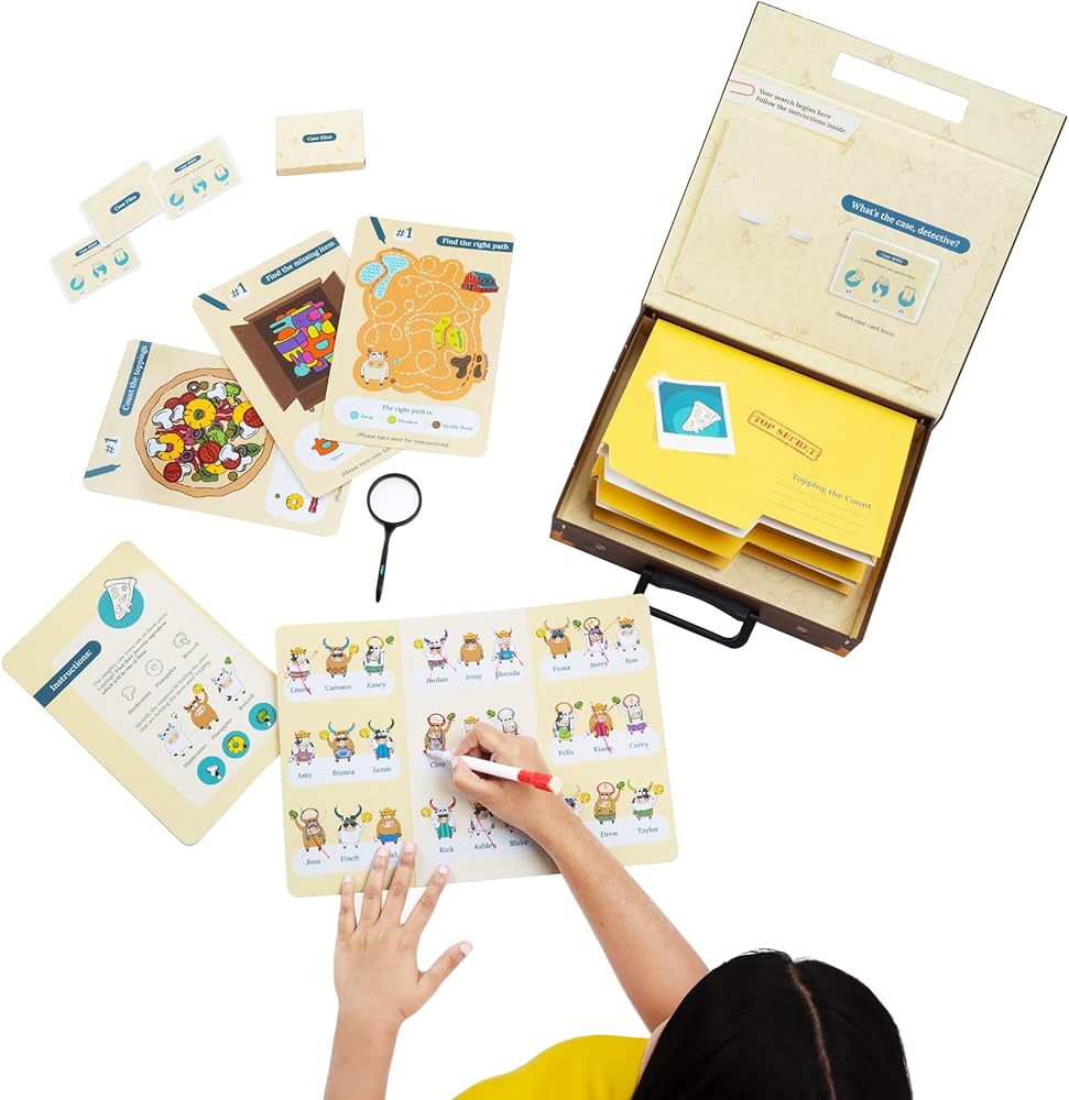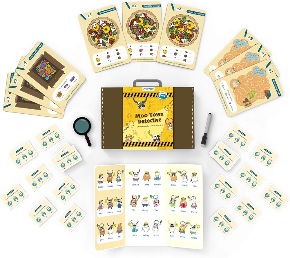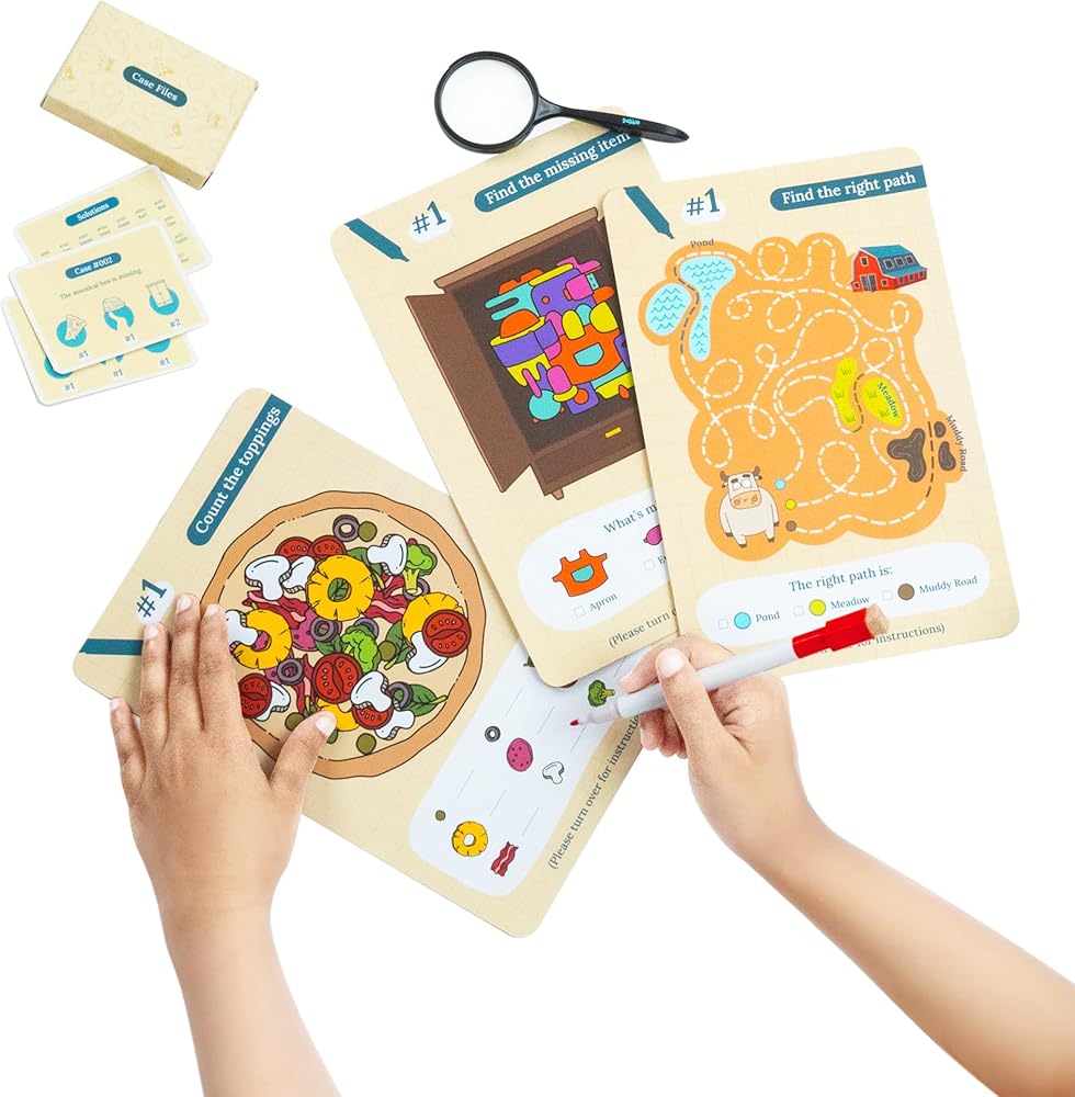 🔍 مليئة بالإثارة! داخل الصندوق: 27 بطاقة حافظة مثيرة للاهتمام، 9 أحجيات مثيرة للعقل، 1 عدسة مكبرة رائعة، 1 قلم ماركر قابل للمسح لمتعة لا نهاية لها!