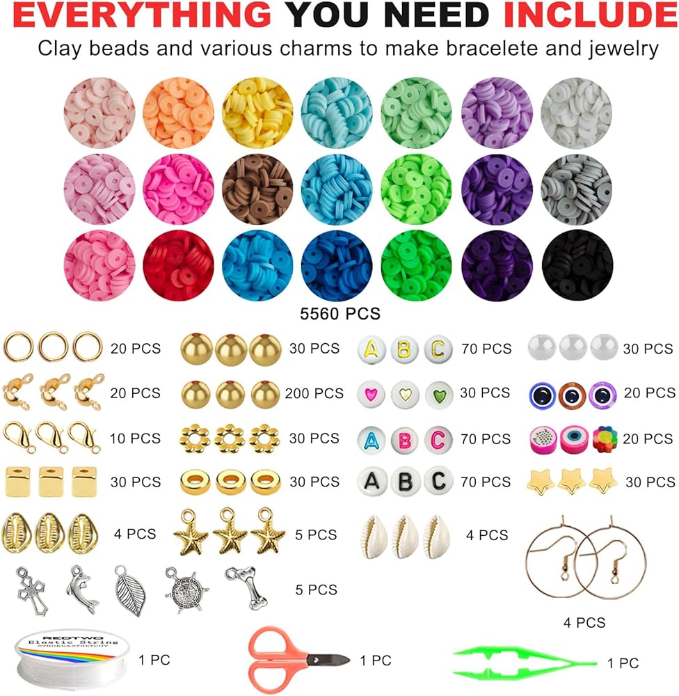 كل ما تحتاجينه يتضمن: لا غنى عنه لمحبي صناعة المجوهرات. صندوق يحتوي على حوالي 5500 قطعة من خرز طين البوليمر المسطح في 21 لونًا و700 قطعة من الحلي (تحتوي على خرز حروف وخرز مبتسم وخرز على شكل قلب ملون وخرز ذهبي ولؤلؤ وأصداف وقلادات وحلقات وصل ومشبك سرطان البحر وما إلى ذلك. )، لفة واحدة من الخيوط المرنة بطول 10 أمتار، 1 مقص، 1 ملقط، لتلبية جميع احتياجاتك لصنع الأساور والمجوهرات.