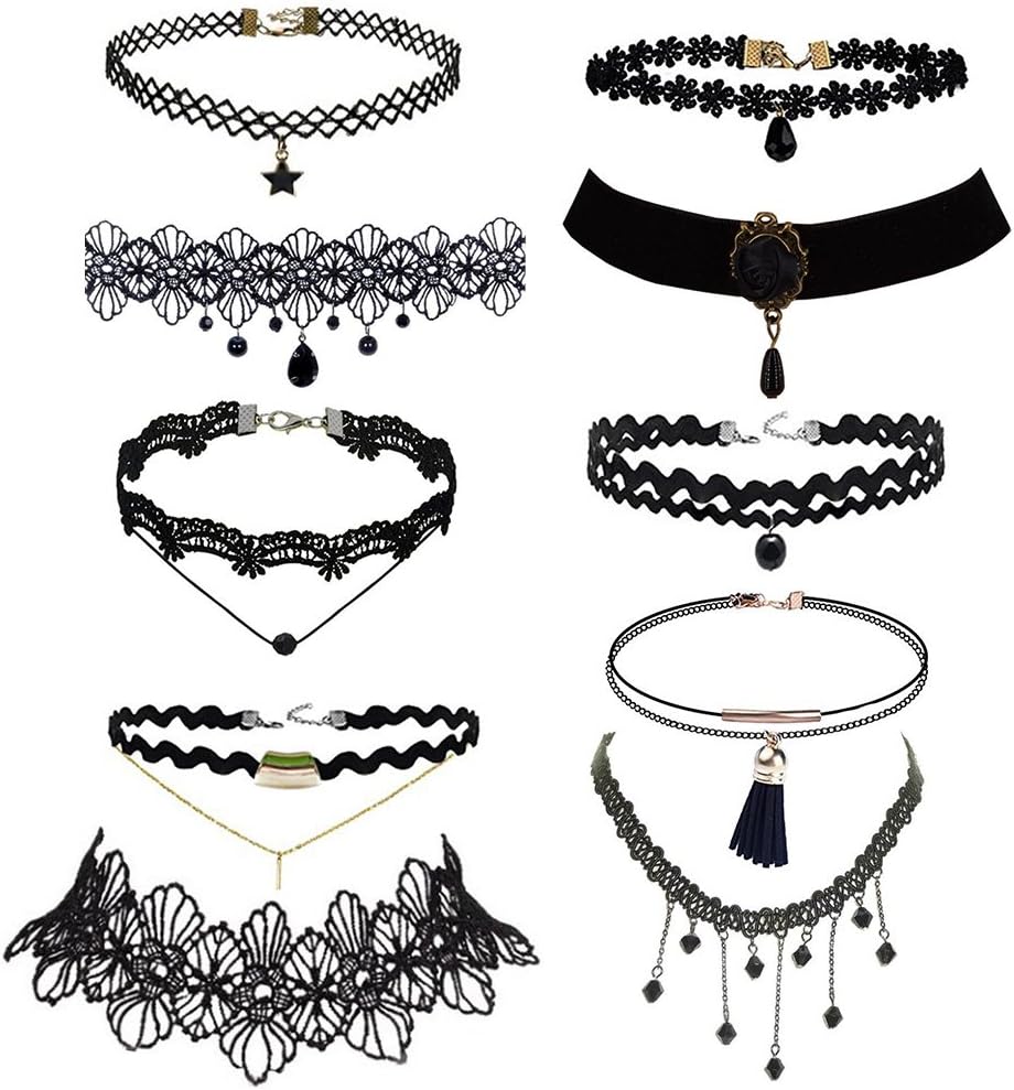 Trasfit 10 قطع قلادة من الدانتيل للنساء والفتيات، أسود كلاسيكي مخملي قابل للتمدد من الدانتيل القوطي (10 نمط #1)