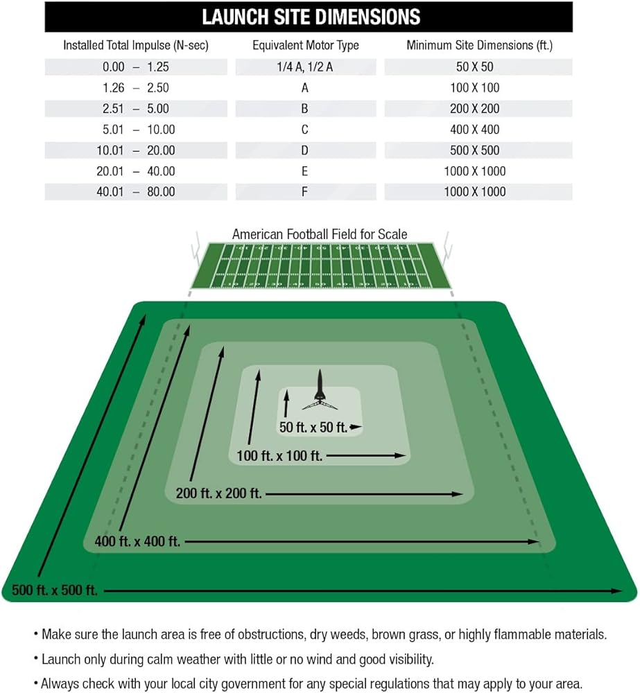 وقت التجميع المقدر: 6 ساعات (وقت تجفيف الطلاء والغراء غير متضمن). نظام الإطلاق: منصة إطلاق بورتا باد II مع قضيب ماكسي 3/16 انش (يباع بشكل منفصل) وجهاز التحكم في الإطلاق E. الأعمار: للأولاد والبنات من سن 10 سنوات فما فوق مع إشراف الكبار لمن هم دون سن 12 عامًا، وصواريخ من جميع الأعمار.