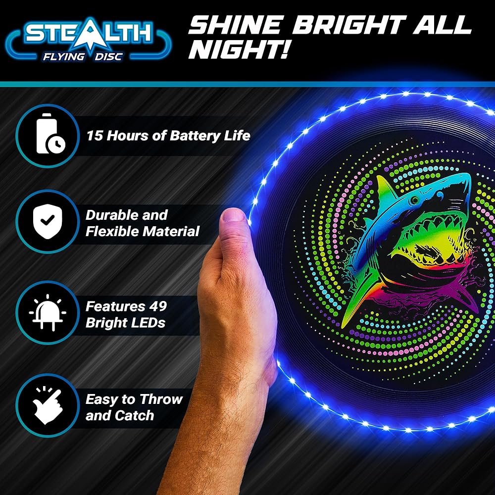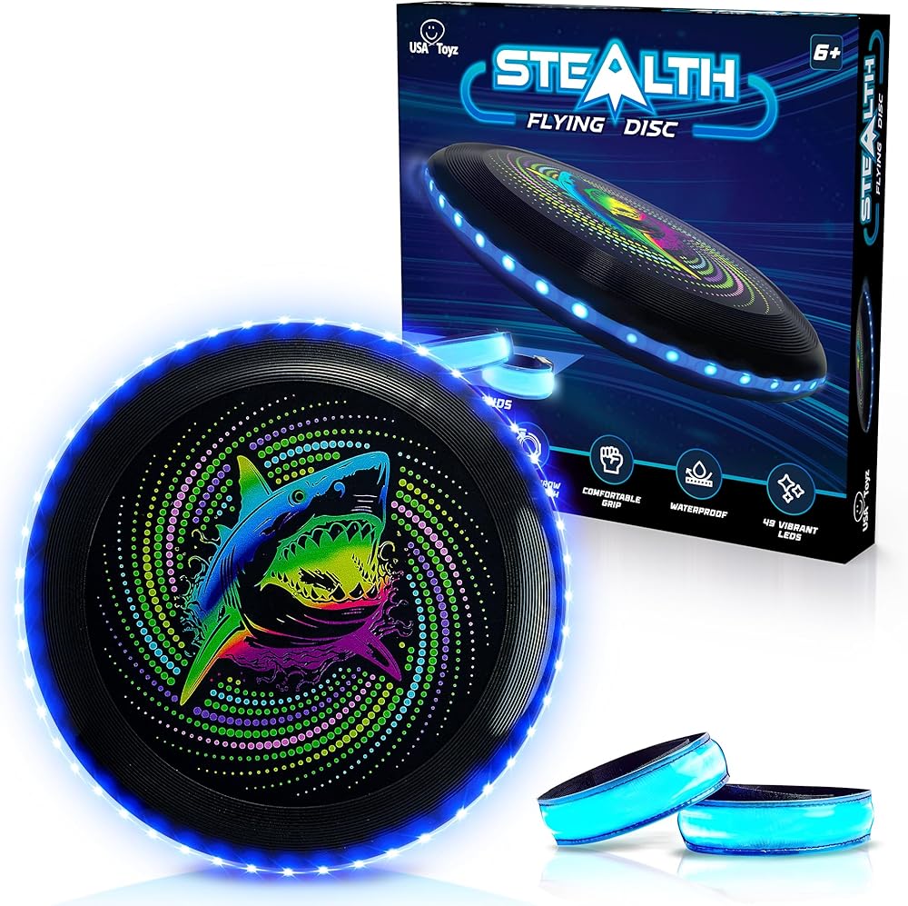 مجموعة أقراص الطيران LED النهائية: ارفع مستوى المرح في الهواء الطلق مع قرص الطيران LED Stealth من USA Toyz - تجربة رمي قرص LED المثالية. يتميز بـ 49 مصباح LED نابض بالحياة وشريطين للذراع LED ساطعين، يمكن استخدام هذا القرص المتوهج في الظلام للبالغين والأطفال ليلاً أو نهارًا. سواء كنت في الحديقة أو الشاطئ، فإن هذا القرص المضيء خفيف الوزن والمقاوم للماء يعد ممتعًا لجميع الأعمار!