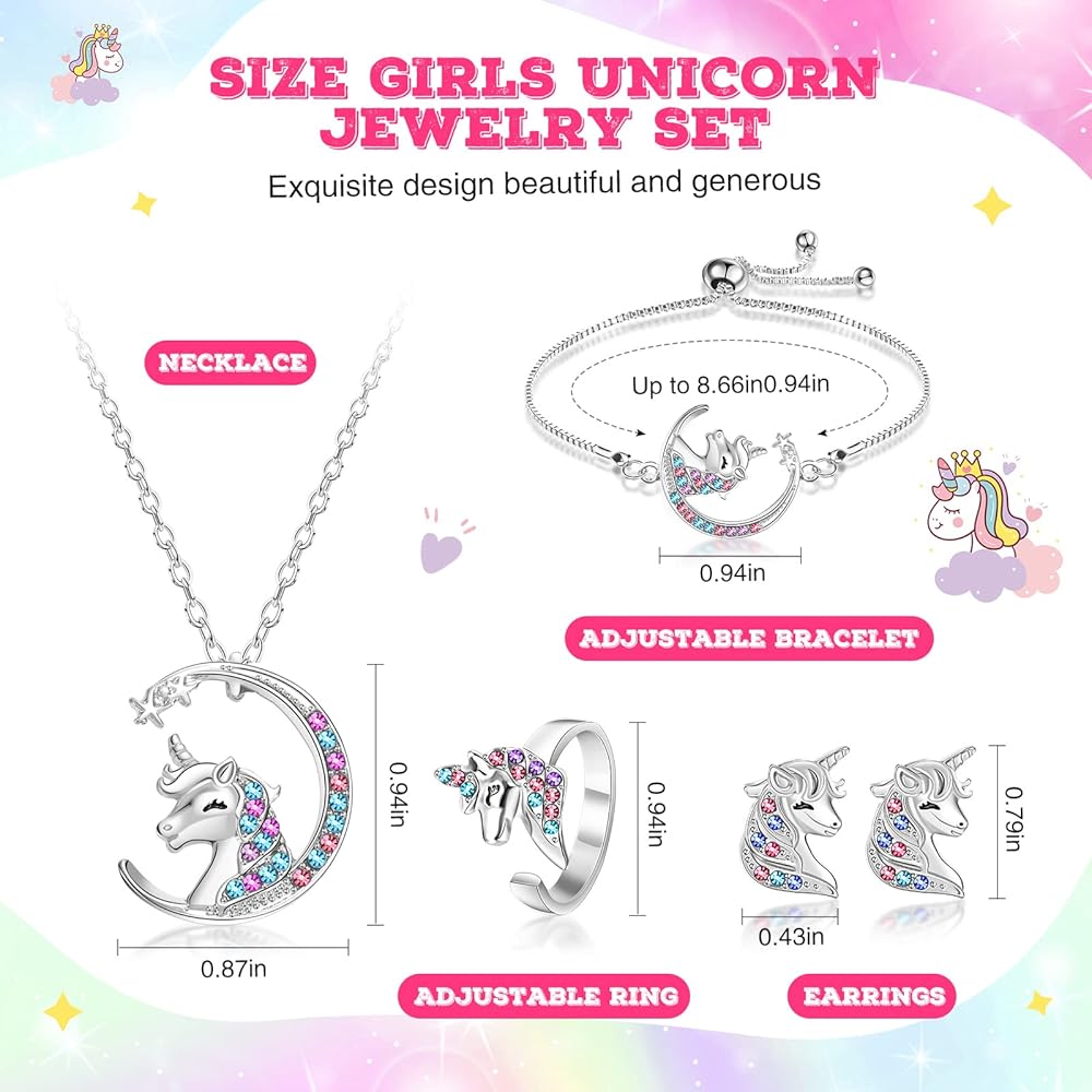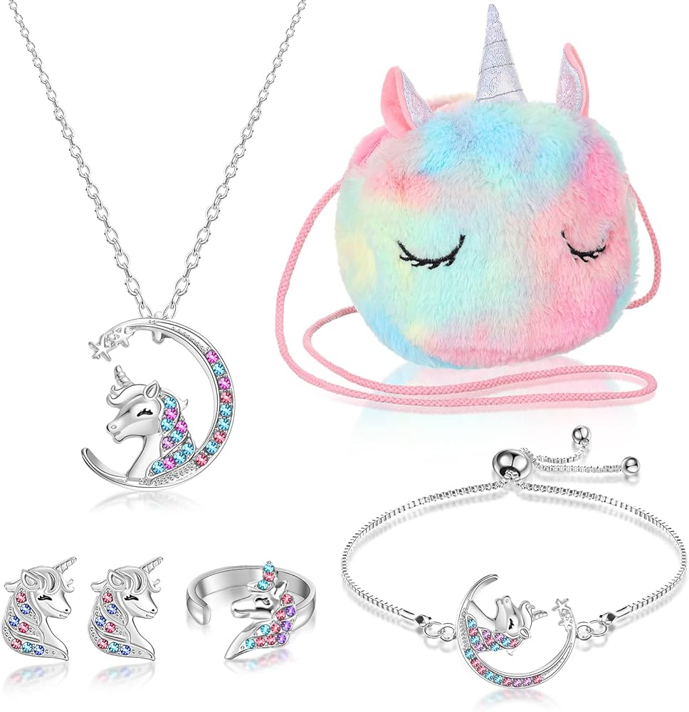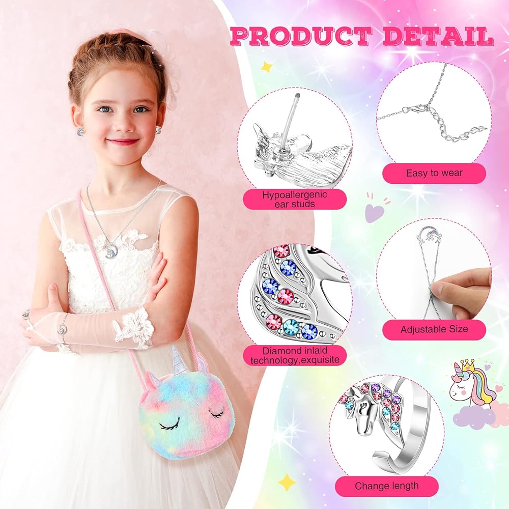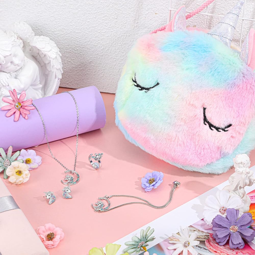 مزيج مجوهرات مثالي للبنات: سوف تحصل على قطعة واحدة من حقيبة محفظة يونيكورن وقطعة واحدة من قلادة يونيكورن، وقطعة واحدة من سوار يونيكورن، وقطعة واحدة من خاتم يونيكورن وزوج واحد من أقراط اليونيكورن، المزيج اللطيف يكفي لأطفالك لارتدائه، ويمكنه تلبية احتياجات الارتداء اليومية بسهولة