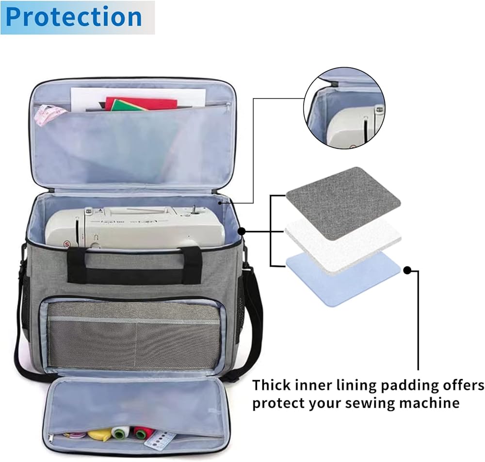• حماية ممتازة - مصنوعة من قماش اوكسفورد شديد التحمل ومقاوم للخدش ومتين. مع الجدران الجانبية المبطنة جيدًا والجزء السفلي المبطن السميك، يمكنك الاطمئنان إلى أن ماكينة الخياطة والملحقات الخاصة بك ستبقى محمية عند السفر. تم تصميم حقيبة ماكينة الخياطة الآمنة والأنيقة هذه لتوفير خيار آمن وخالي من الغبار يحمي أيضًا من الصدمات والخدوش.
