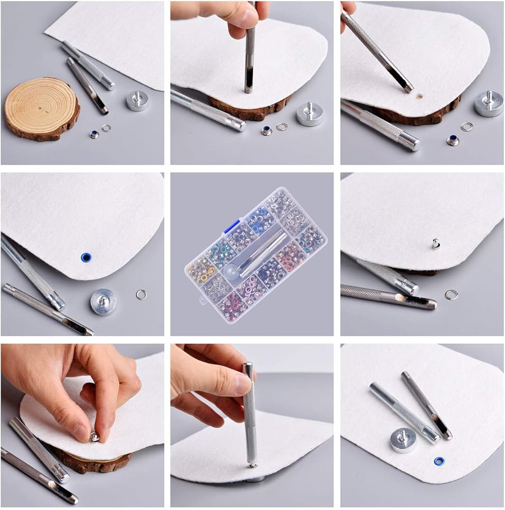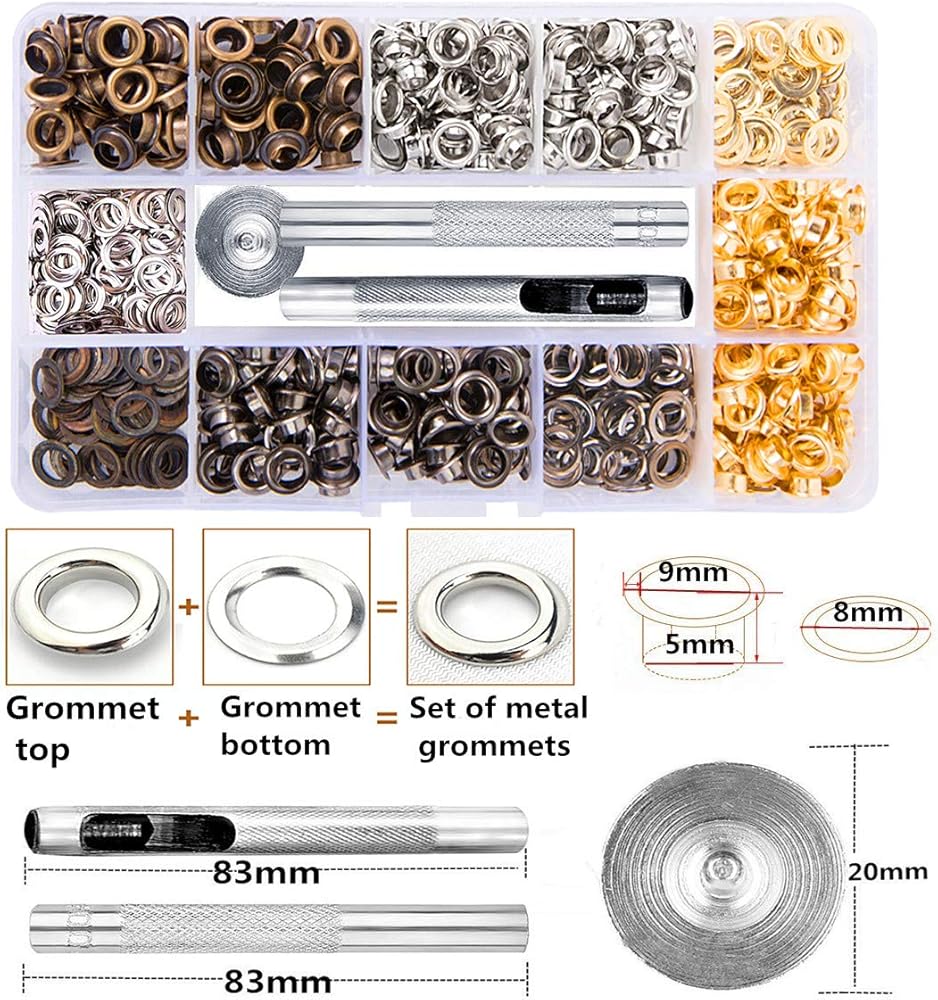 مجموعة حلقات معدنية 3/16 بوصة 400 قطعة من حلقات الحلقات المعدنية مع 3 قطع مجموعة أدوات تثبيت وصندوق للأحذية والملابس وحقيبة الحرف اليدوية لمشروع DIY 4 ألوان
