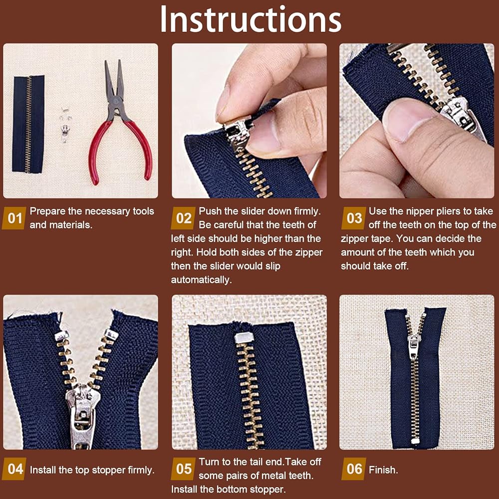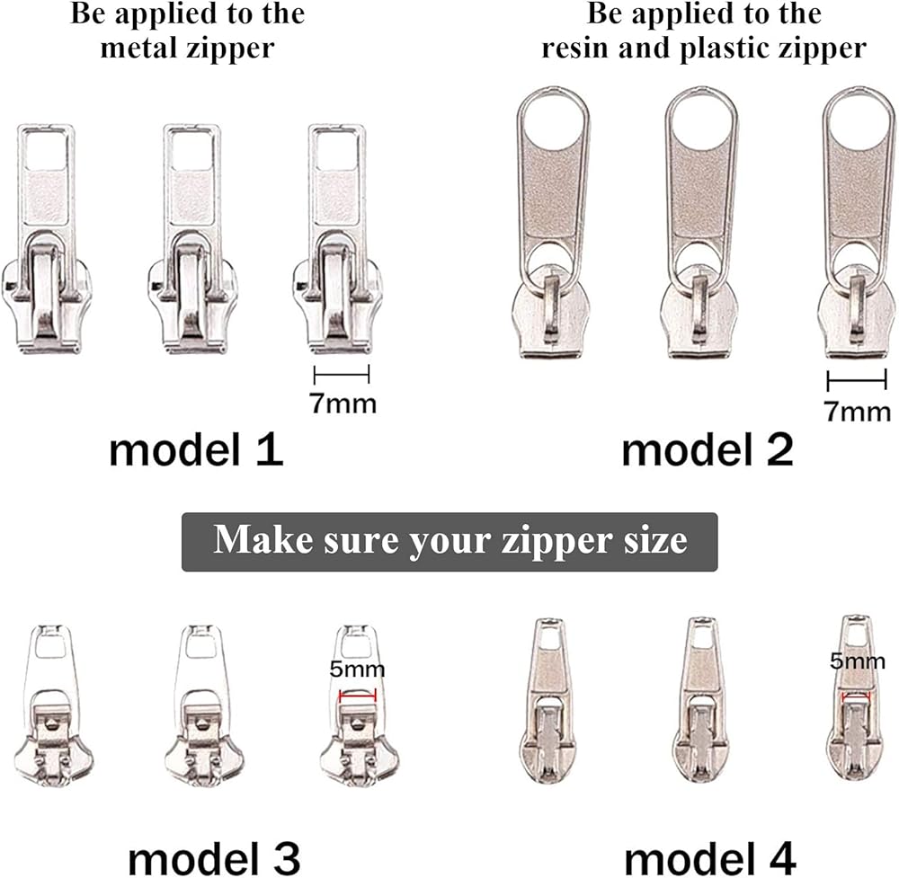 يناسب الجينز والتنانير والسراويل الرسمية والمحافظ والسويت شيرت والجاكيت، إلخ. المواصفات: (وفقًا للصورة) الطراز 1 والطراز 3 يمكن استخدام استبدال السحّاب المعدني فقط. يمكن وضع استبدال السحاب من الطراز 2 والطراز 4 على الراتنج والسحّاب البلاستيكي. ملاحظة: تأكد من نوع السحاب وحجمه قبل شراء سحاب بديل. كيفية تركيب استبدال السحَّاب: 1. أولاً، قم بإزالة المحطات المعدنية الموجودة أعلى شريط السحّاب، يجب خلع كلا جانبي التوقف المعدني. 2. حرّك المنزلق إلى أعلى شريط السحّاب، وقم بمحاذاة أسنان السحّاب. 3. قم بتركيب المزلاج في شريط السحَّاب: اجعل اليد اليسرى تمسك الشريط الجانبي بالسحاب، واستخدم يدك اليمنى لسحب المزلاج إلى أسفل أسنان السحّاب. 4. إذا كنت من الصعب سحب المزلاج إلى أسنان السحّاب، يمكنك استخدام بعض الشمع وتجريب بعض الزيت لتلميع أسنان السحاب لجعله أسهل.