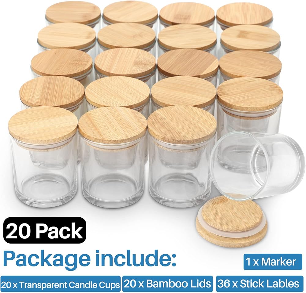 【برطمانات زجاجية صالحة للطعام】 تحتوي بأمان على جميع الحرف اليدوية الخاصة بك. 20 قطعة من البرطمانات الزجاجية المستديرة الشفافة + 20 غطاء من الخيزران + 30 علامة بيضاء (18 فارغة و18 مطبوعة يدويًا)