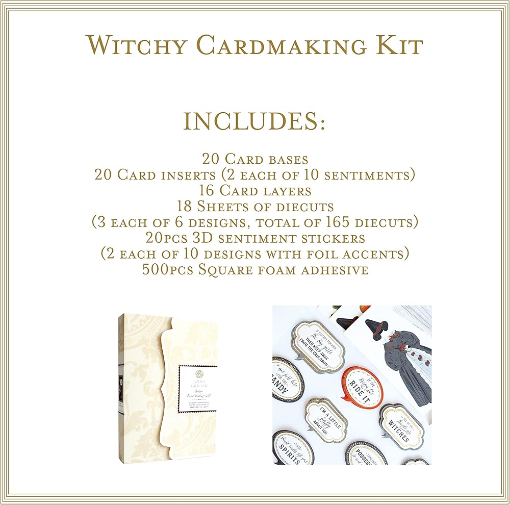 انا جريفين مجموعة صنع البطاقات الساحرة هي مجموعة شاملة لصنع البطاقات مصنوعة خصيصًا لموسم الهالوين. اصنع البطاقة المثالية واستخدم مجموعة البطاقات هذه لإنشاء بطاقات احتفالية بشكل مخيف لنشر روح الهالوين. مع هذه المجموعة من أغطية البطاقات، يمكنك إطلاق العنان لإبداعك. مع هذه المجموعة التي تصنعها بنفسك، لن تنفد أبدًا طرق تخصيص أعمالك للهالوين. تتضمن هذه المجموعة: - 20 قاعدة بطاقة؛ - 20 بطاقة إدراج (2 لكل منها 10 مشاعر)؛ - 16 طبقة بطاقات؛ - 18 ورقة من القطع (3 لكل 6 تصميمات، إجمالي 165 قطعة ديديكوت)؛ - 20 قطعة من ملصقات المشاعر ثلاثية الأبعاد (2 لكل 10 تصميمات مع لمسات من الرقائق المعدنية)؛ - 500pcs مربع مربع 50لاصق إسفنجي - حافظة تخزين