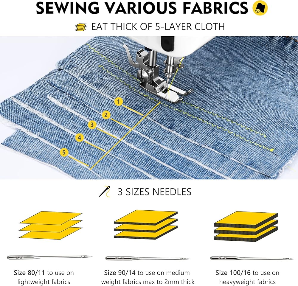 • 3 أنواع من الإبر: ماكينات الخياطة Magicfly المجهزة بثلاثة أنواع من الخيوط للأقمشة ذات السماكات المختلفة. مقاس 80/11 للاستخدام على الأقمشة خفيفة الوزن؛ مقاس 90/14 للاستخدام على الأقمشة متوسطة الوزن التي يصل سمكها إلى 2 مم كحد أقصى؛ مقاس 100/16 للاستخدام على الأقمشة الثقيلة