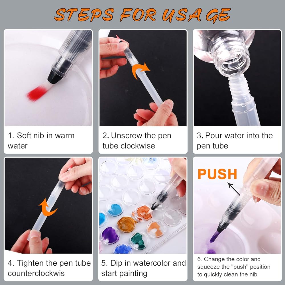【أقلام الفرشاة】: مجموعة فرش طلاء متعددة الاستخدامات بـ 10 أحجام و6 أحجام من قلم فرشاة المياه القابل لإعادة الملء مع مجموعة متنوعة من الأشكال تجعل مزج الألوان أسهل. بعد استخدام الفرش، من المريح جدًا تنظيفها بالماء الدافئ والصابون وإعادة تشكيل أطراف الفرشاة. جففي الفرش بالهواء وخزنيها في مكان جاف لفترة طويلة من الاستخدام.