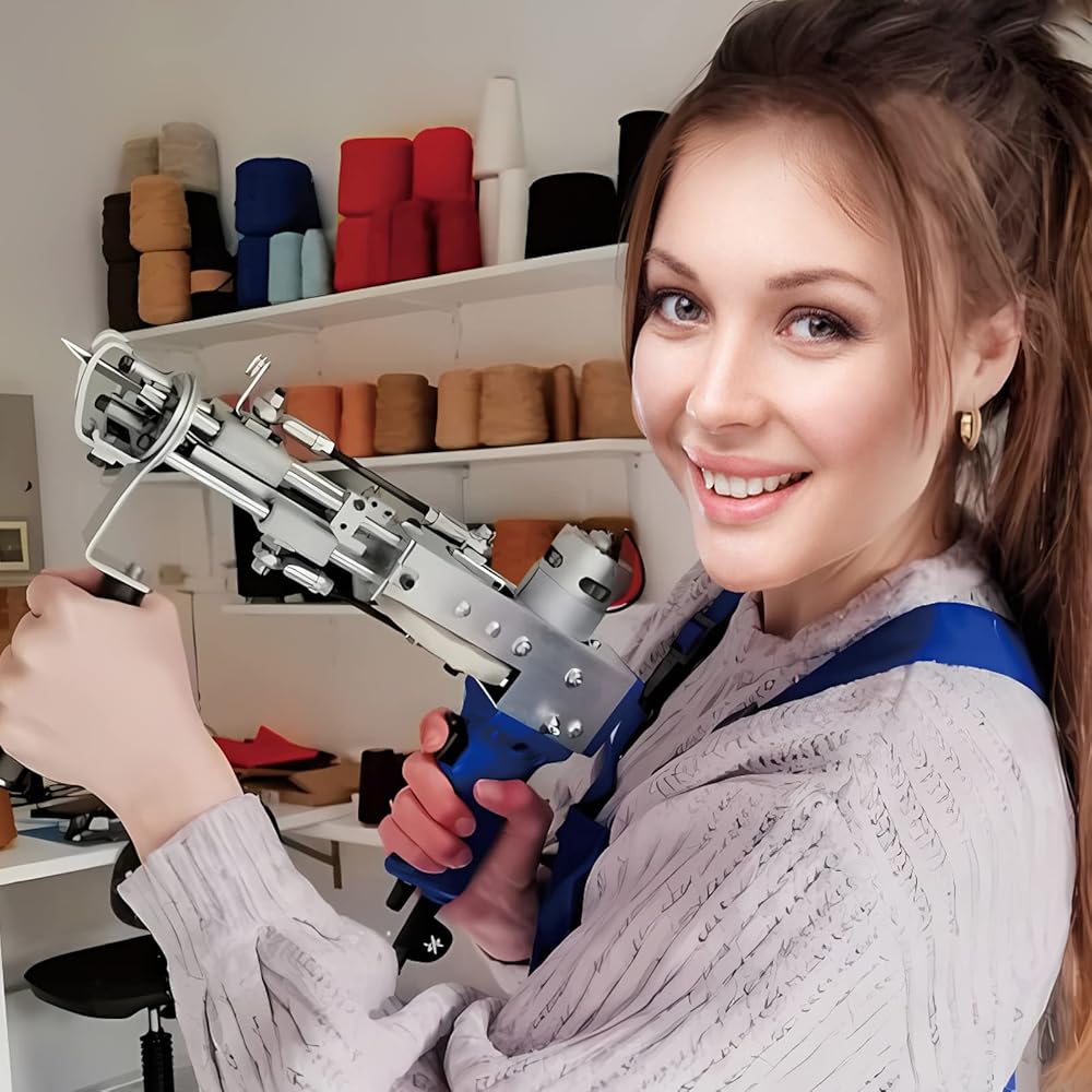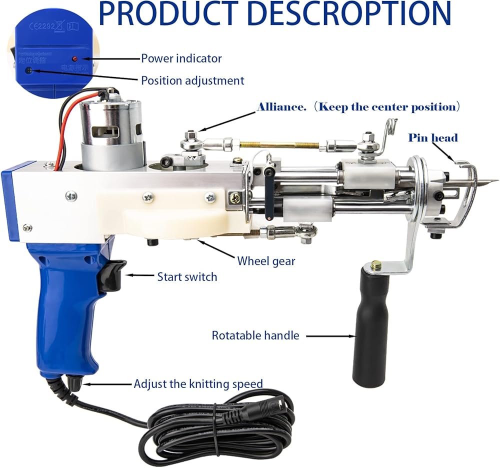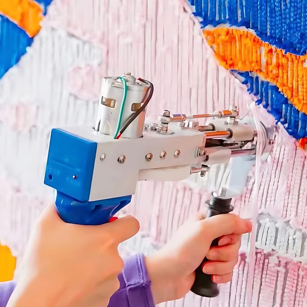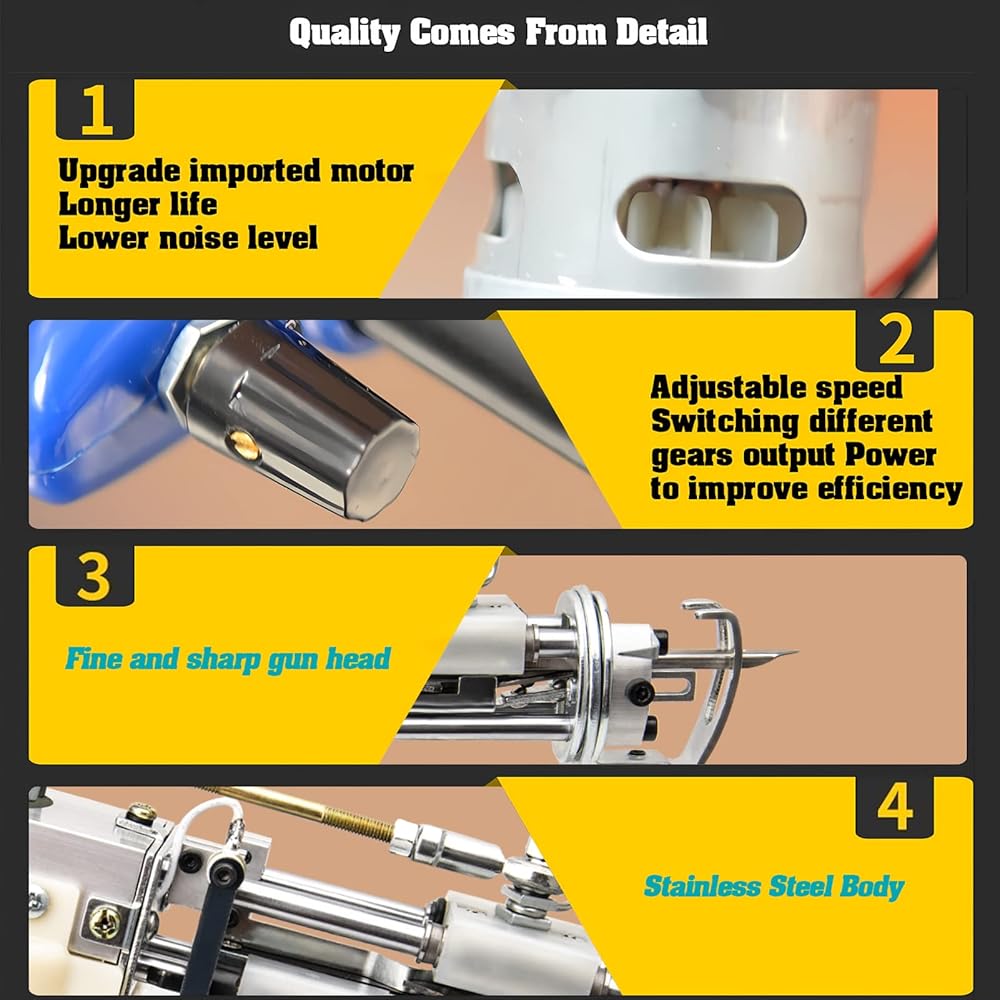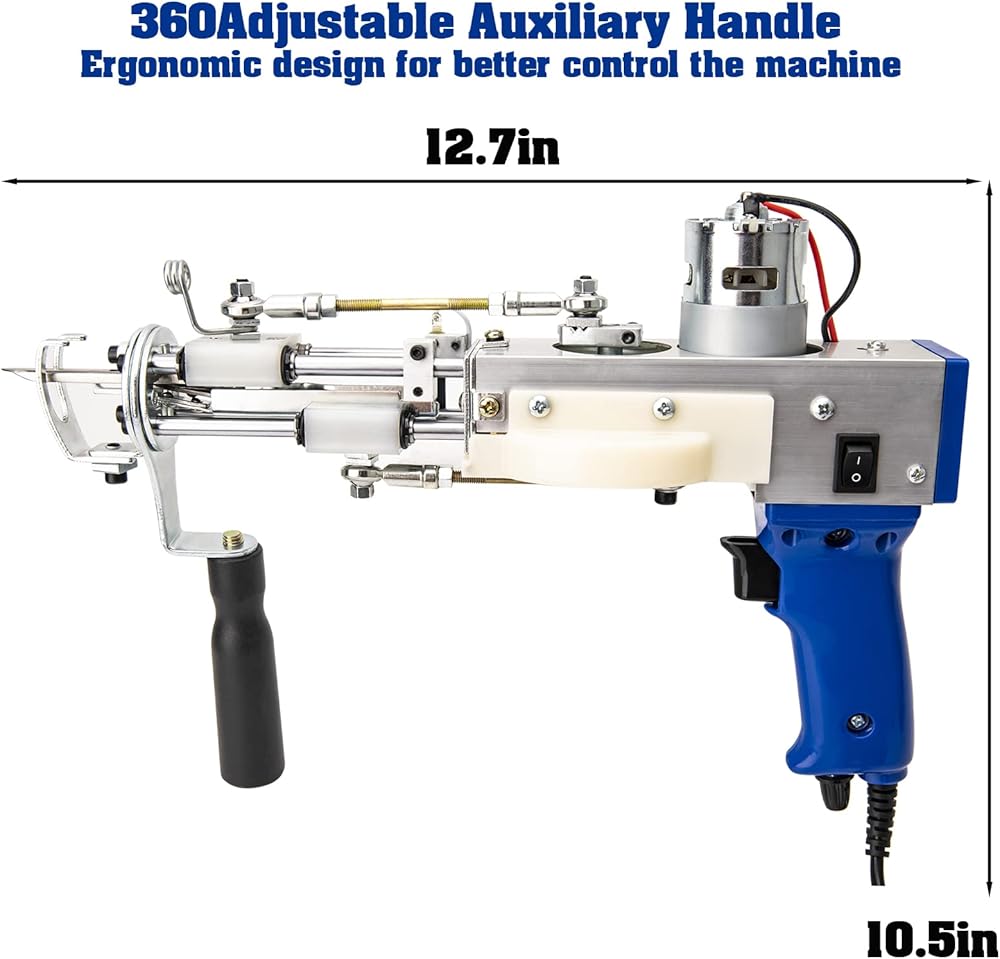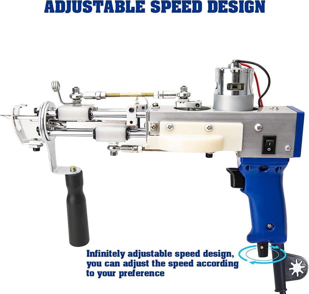 • إن آلة خصلة السجاد، المضمنة في مجموعة صنع السجاد، هي أداة قوية يمكنك صنعها بنفسك مع نطاق سرعة يتراوح بين 5-45 غرزة في الثانية. إنها تسمح بتعديل ارتفاع السجاد من 7 إلى 19 ملم، مما يؤدي إلى زيادة ملحوظة في الإنتاجية تصل إلى 80 إلى 100 مرة مقارنة بالإنتاج اليدوي.