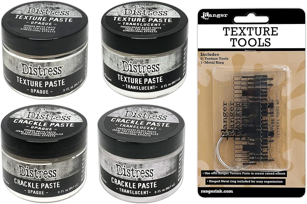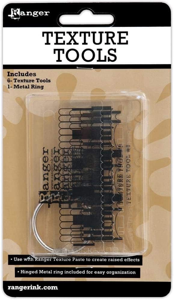 تيم هولتز ديست معجون الخشخشة غير شفاف - يجف غير شفاف، غير لامع مع تأثيرات الأبعاد المتشققة.. ضع المعاجين بسكين باليت أو فرشاة طلاء مباشرة على الأسطح المسامية أو غير المسامية للحصول على تأثيرات فريدة. يمكن تلوين معجون الملمس سواء كان مبللاً أو بمجرد تجفيفه للسماح بإمكانيات ألوان لا حصر لها.. أدوات الملمس - تتضمن ستة أنماط مختلفة لتشكيل الملمس وحلقة معدنية واحدة.