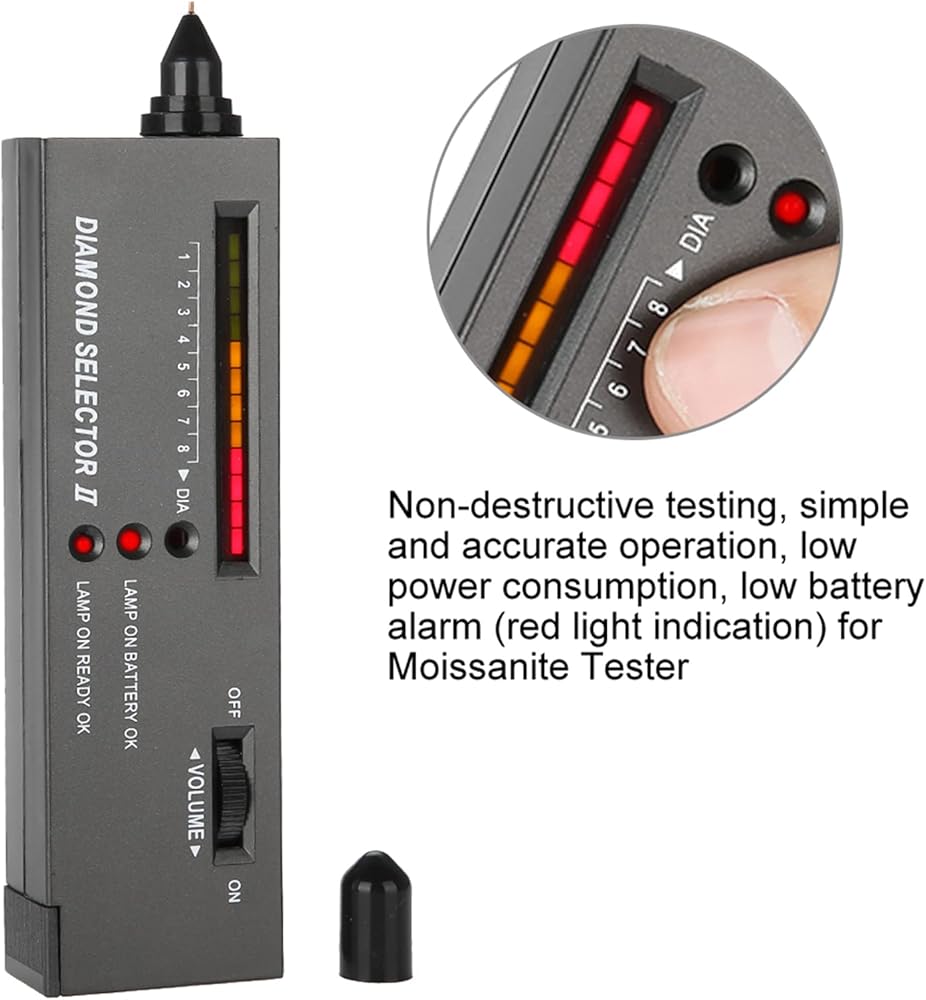 من السهل التعرف عليها: سيظهر المؤشر الأخضر على Diamond Selector II إذا كان الحجر ألماسًا حقيقيًا. سوف يصدر صوت طنين مستمر عندما يلمس المستخدم المعدن عن طريق الخطأ بدلاً من الحجر.