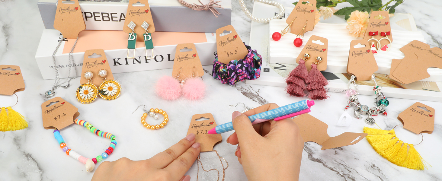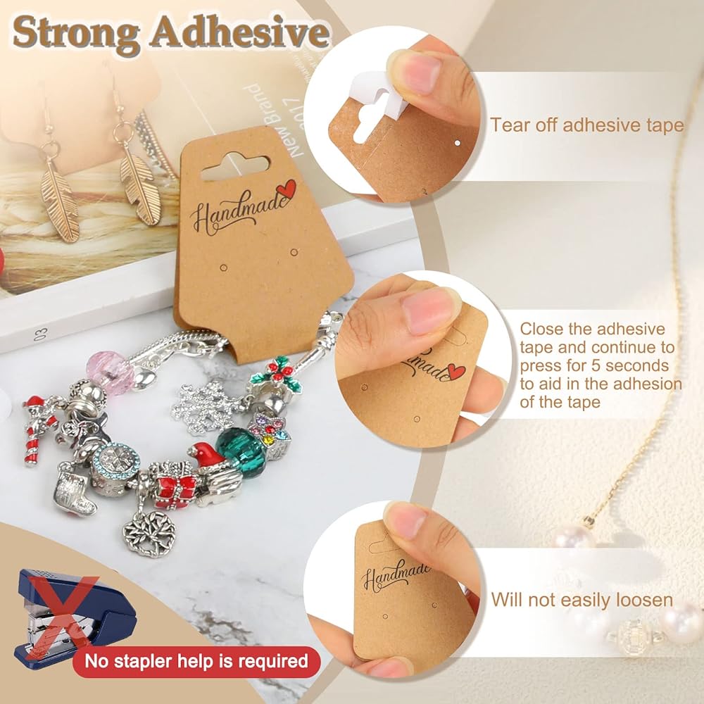 [بطاقة عرض حلق ذاتية اللصق]: باستخدام شريط توزيع 1.2 سم للربط، قوة اللصق قوية جدًا، ولا تحتاج تمامًا إلى غراء إضافي لتجميع البطاقة، مما يوفر لك الكثير من الوقت والجهد. تحتوي بطاقة القلادة على ثقوب في الأعلى لسهولة تعليقها على رف العرض.