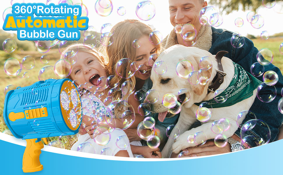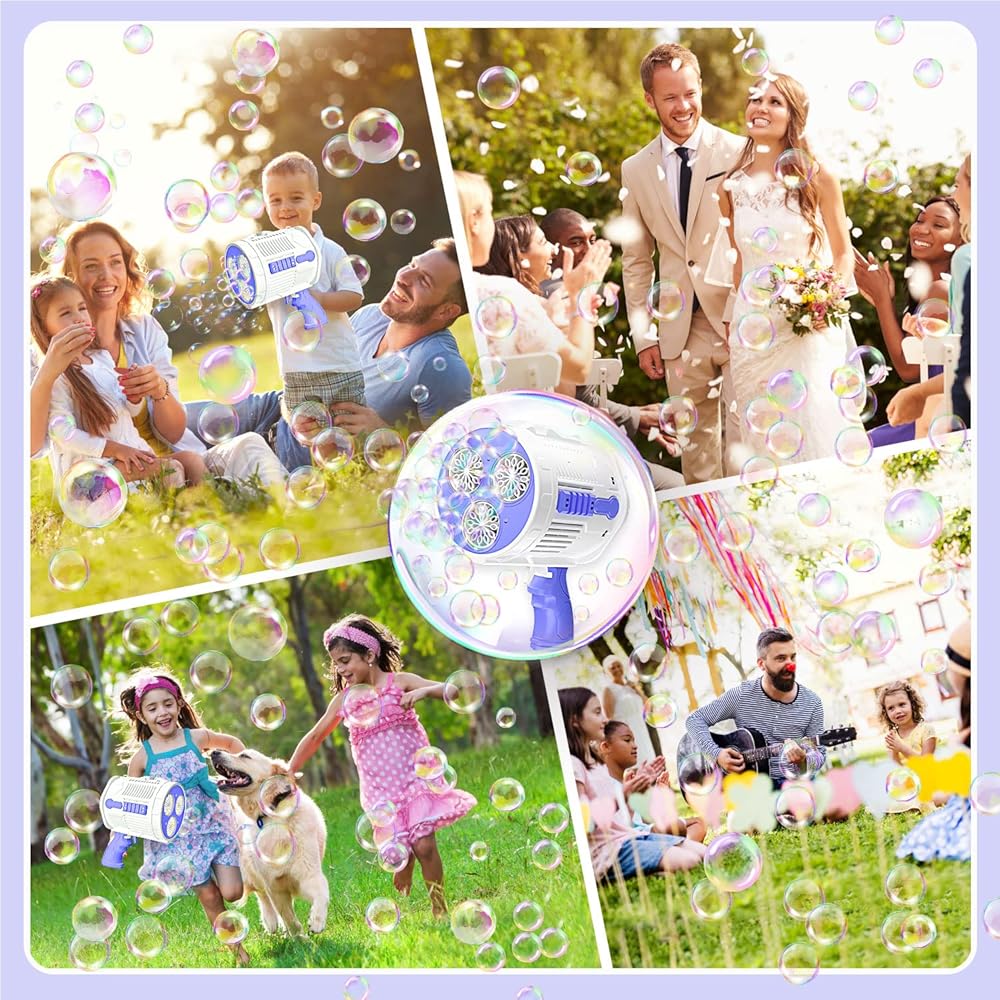 فقاعات حالمة مع أضواء - تحت خلفية الأضواء الملونة، يصبح الجو الليلي أكثر حالمة ورائعة. يعمل الدوران التلقائي متعدد المسام على إنتاج فقاعات شفافة بشكل مستمر لآلة الفقاعات، مما يجعلها الخيار الأفضل للحفلات الليلية. مجهزة بحزام كتف، يمكن للأطفال حمل قاذف الفقاعات بسهولة والاستمتاع بمتعة مطاردة الفقاعات.