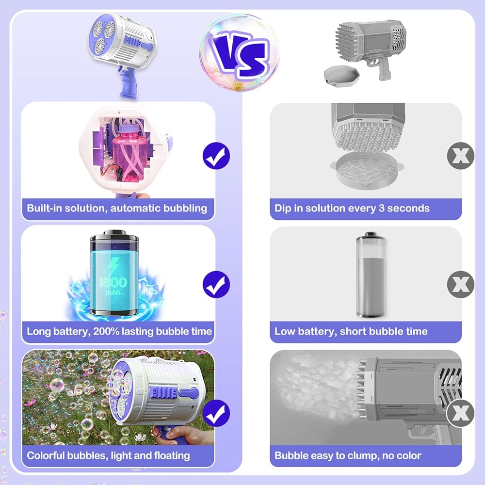 تصميم مطور حديثًا - مسدس فقاعات أوتوماتيكي. يتميز التصميم الجديد بوجود سائل فقاعي مدمج - مدفع رشاش فقاعي بدون تراجع. فقط اضغط على الزناد، يمكنه إنتاج فقاعات بشكل مستمر باستخدام 36 فتحة، تصميم دوار 360 درجة يمكنه إنشاء أكثر من 15000 فقاعة في الدقيقة مع طاقة الرياح القوية. وقت إخراج الفقاعات الأطول وإجراءات التشغيل الأبسط تجعل الأمر أكثر ملاءمة للأطفال والكبار للعب معركة لعبة الفقاعات.