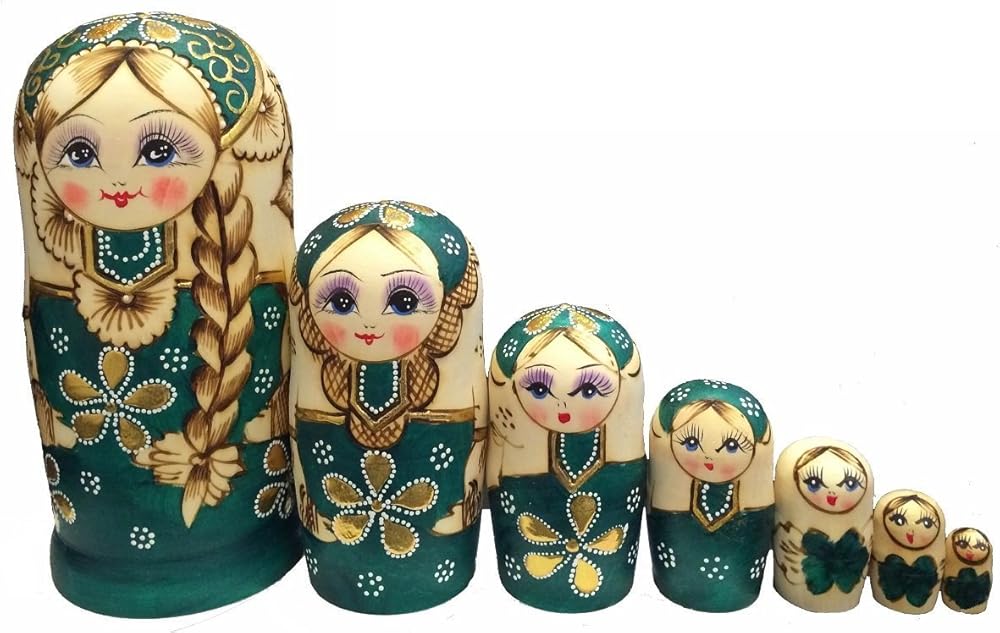 • هذه الدمى هي عمل فني روسي تقليدي. تم نحت دمى التعشيش هذه من قطعة واحدة من الخشب ثم تم تقسيمها إلى قطع. تم طلاؤها يدويًا بعناية فائقة من قبل أفضل عمال السوق