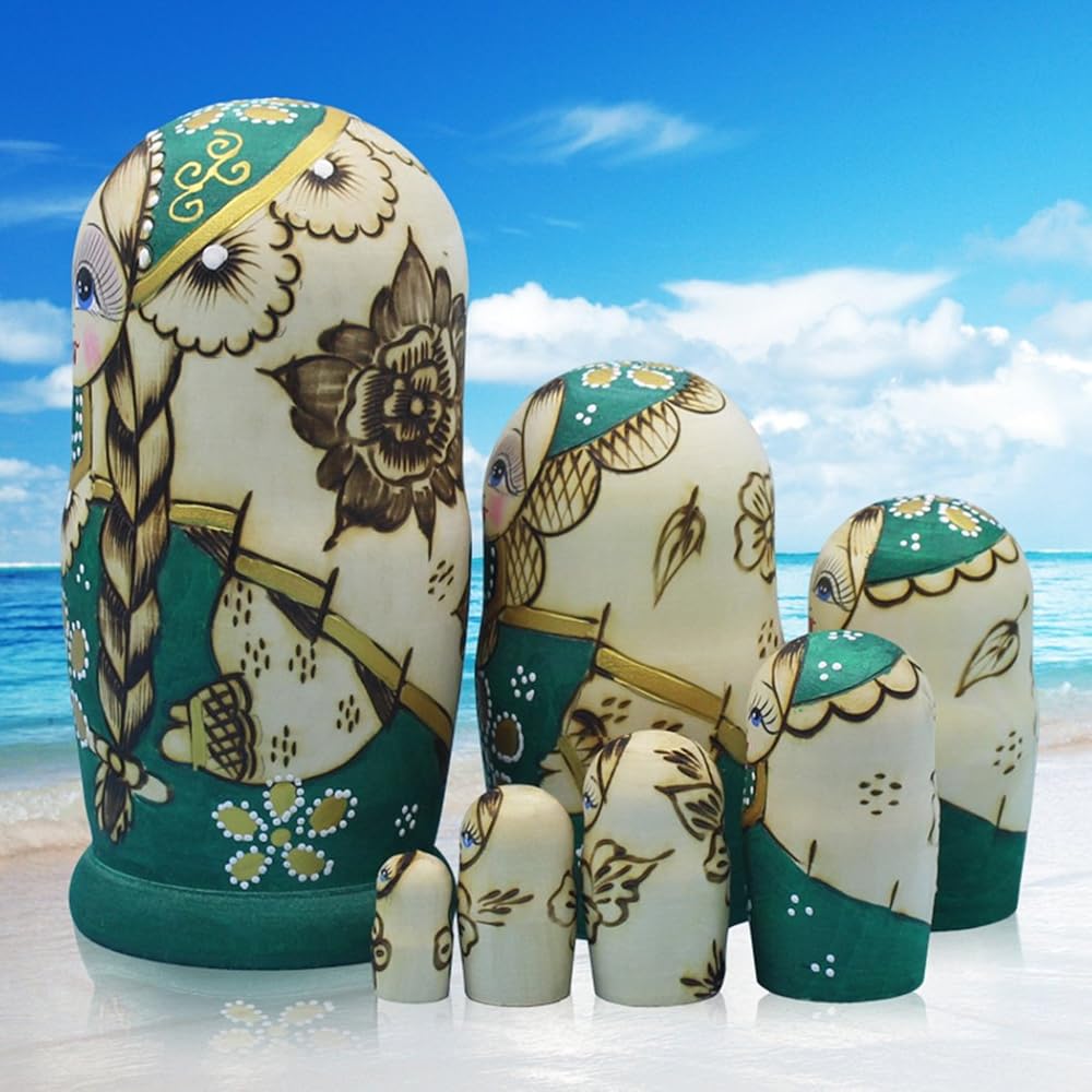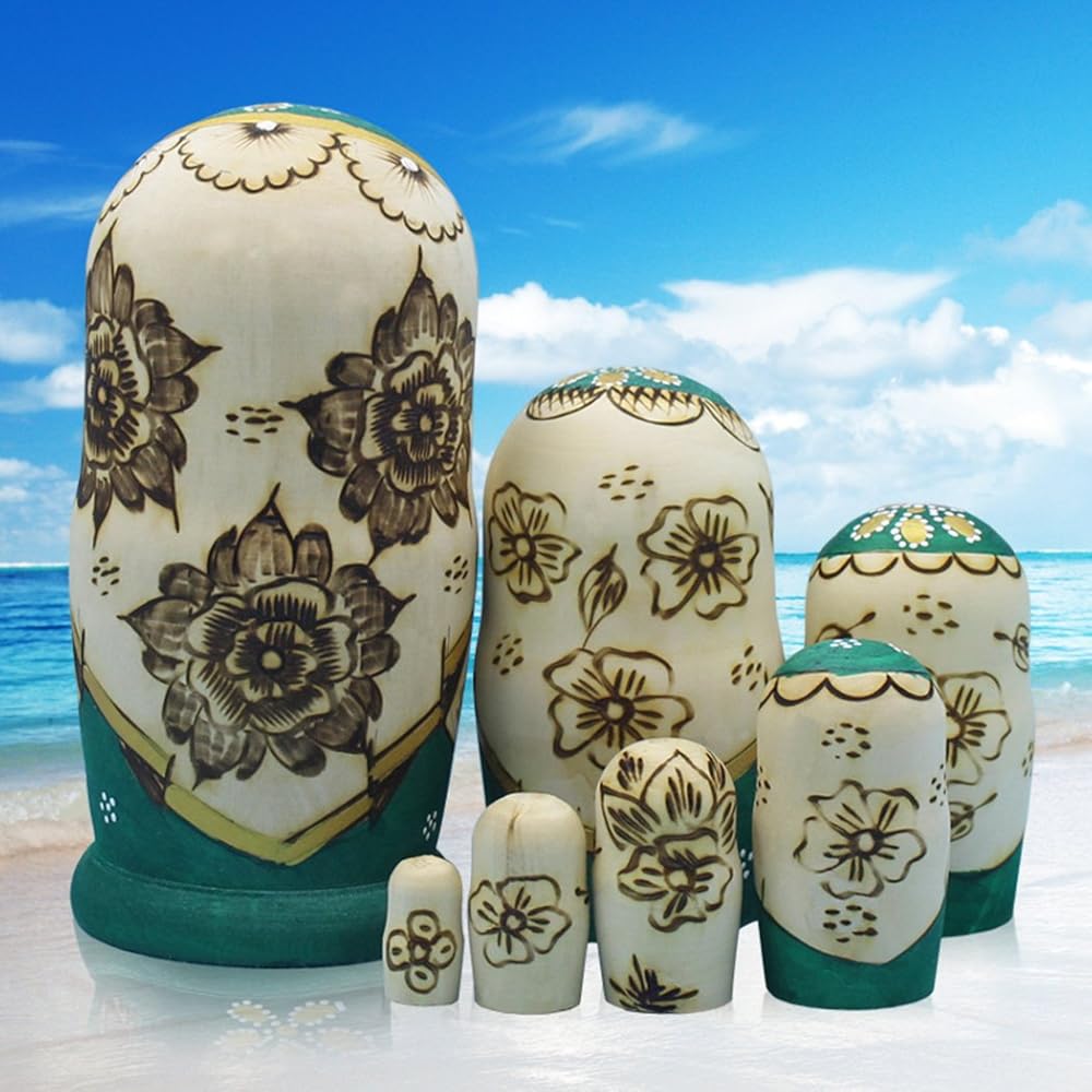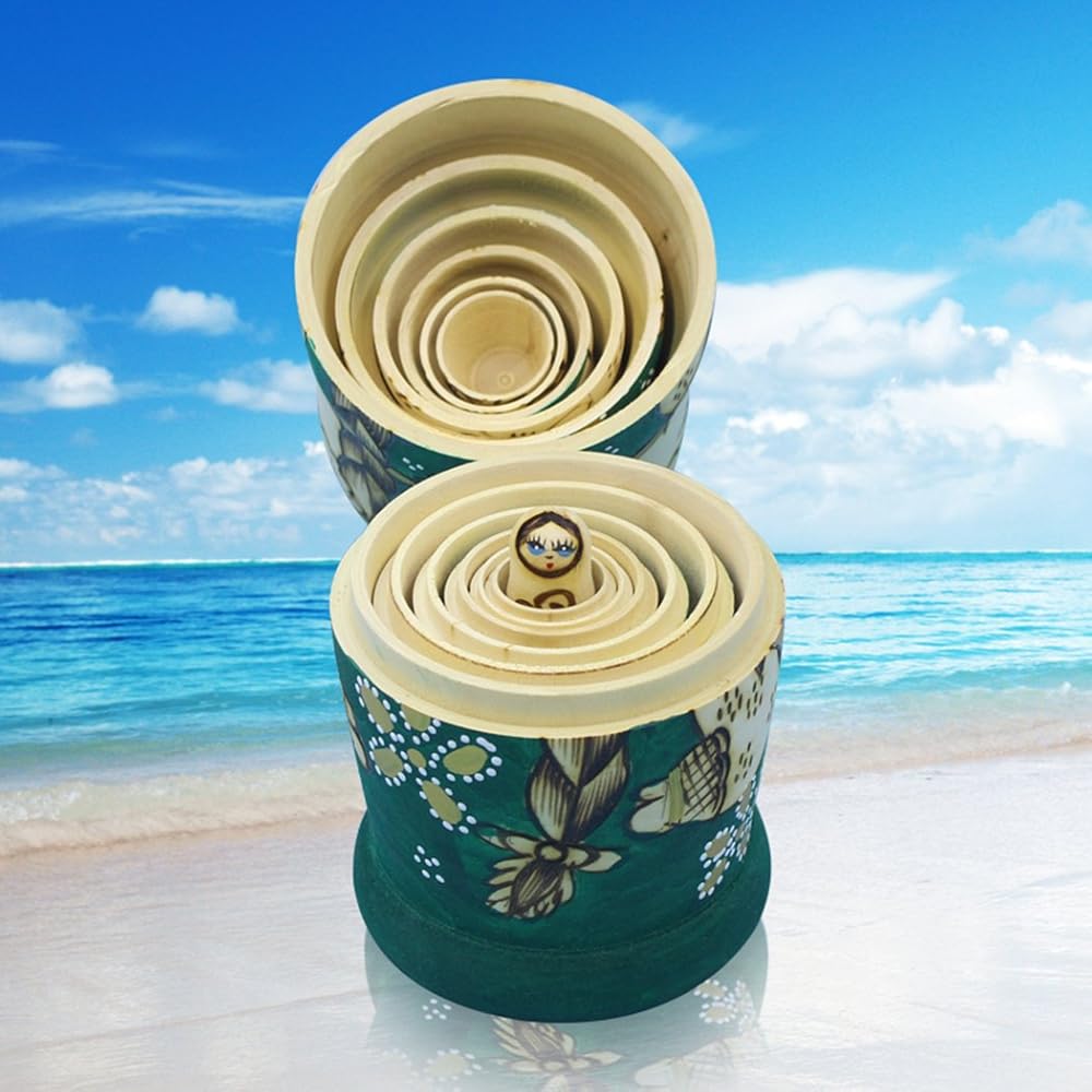 مونمو 7 قطع من دمى التعشيش الروسية الخشبية الجميلة المصنوعة يدويا هدية دمى التعشيش الروسية الخضراء الرسم ماتريوشكا التقليدية.