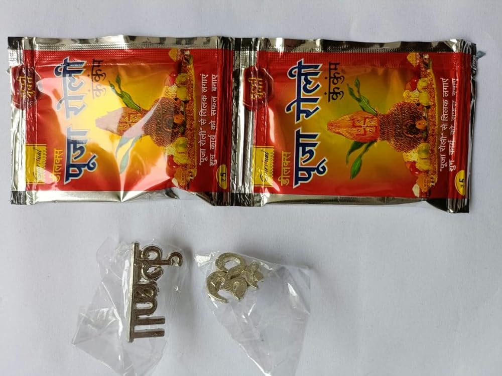 3 ختم تيلاك للجبهة، أداة توزيع تيكا، أداة تيلاك / تيكا 1. رادي 2. كريشنا 3 أوم مع رولي (عبوة من 3 أدوات)، فضي وأحمر