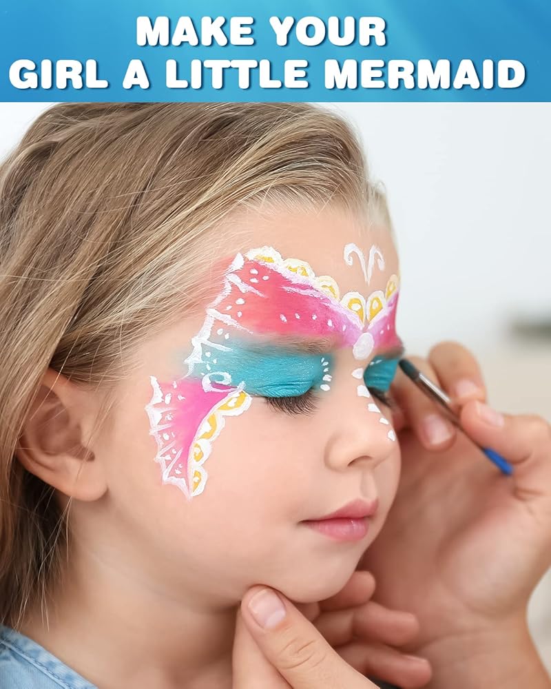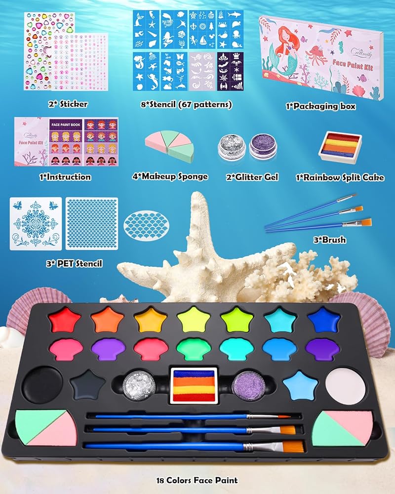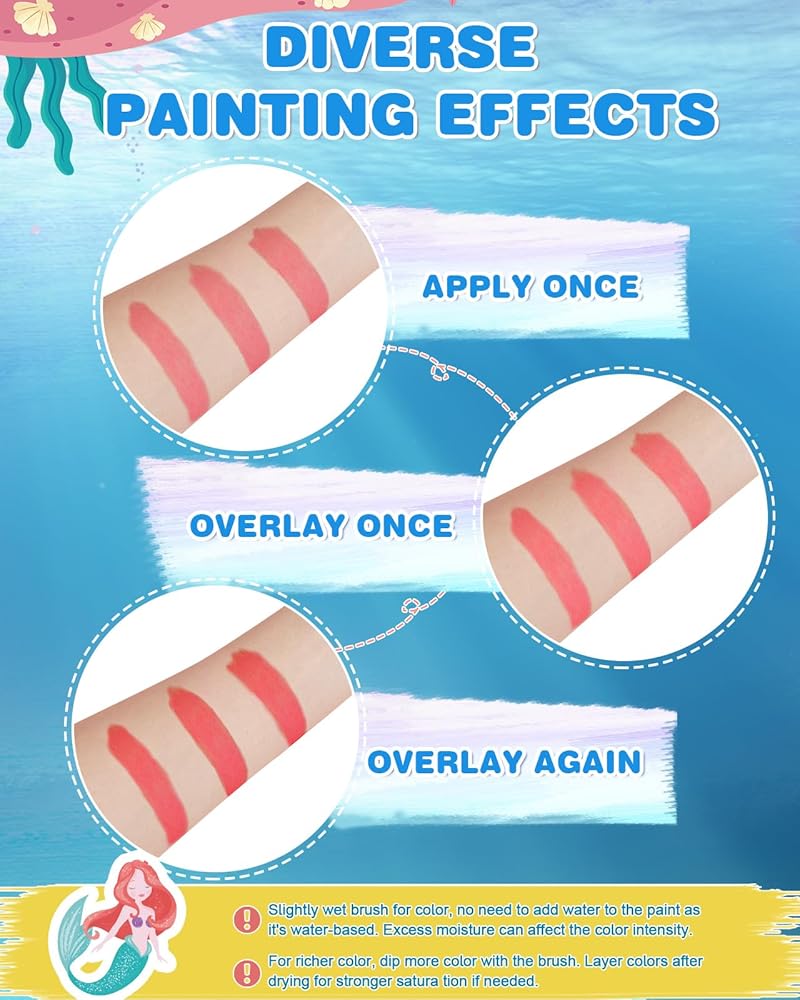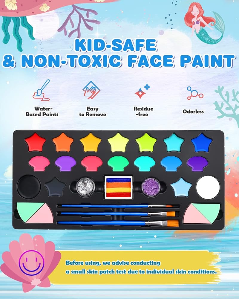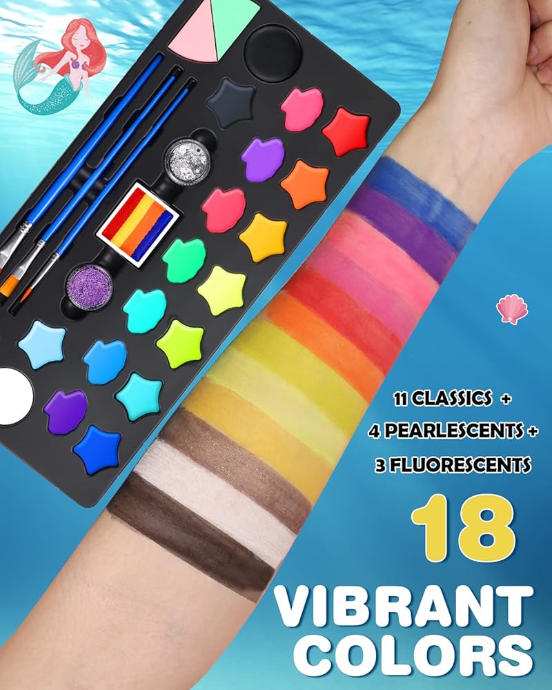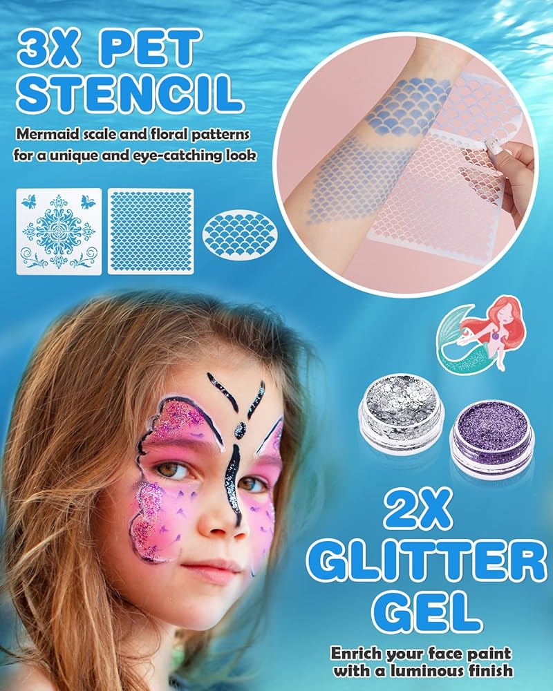Versatile Use & Perfect Gift: Suitable for Halloween Makeup, theme costume party, carnivals, birthdays, school events, cosplay, sports painting, etc. The exquisite mermaid-themed packing box makes it a perfect gift for your little artists.