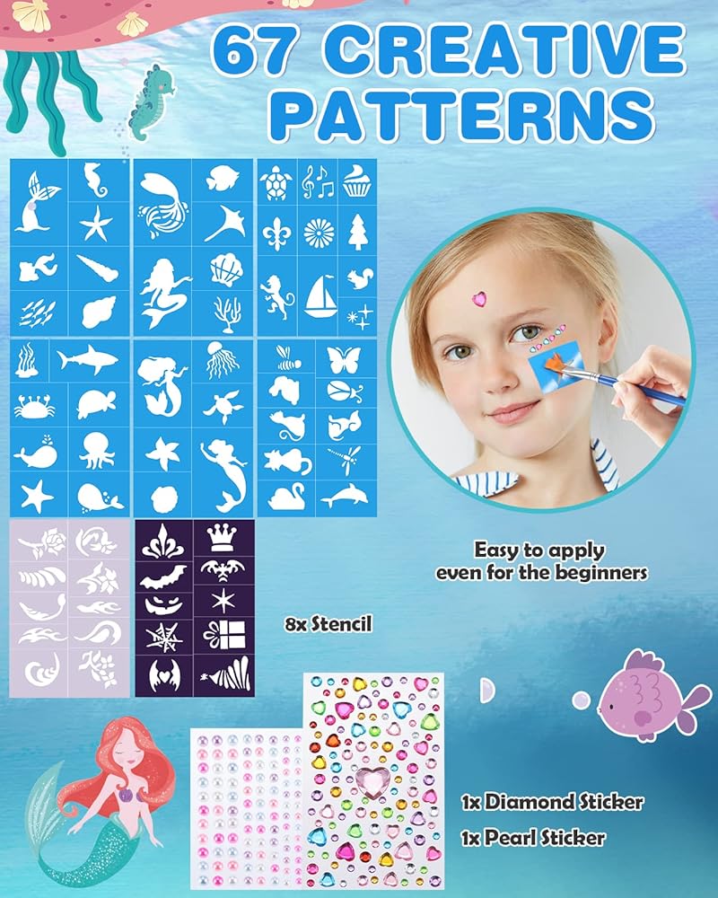 Ocean-themed Body Paints: The face body painting kit includes reusable PET templates of mermaid scales and floral patterns for large-scale depiction. It also includes 67 creative stencils with exclusive customized ocean elements, which are specially designed to cater to the needs of beginners.