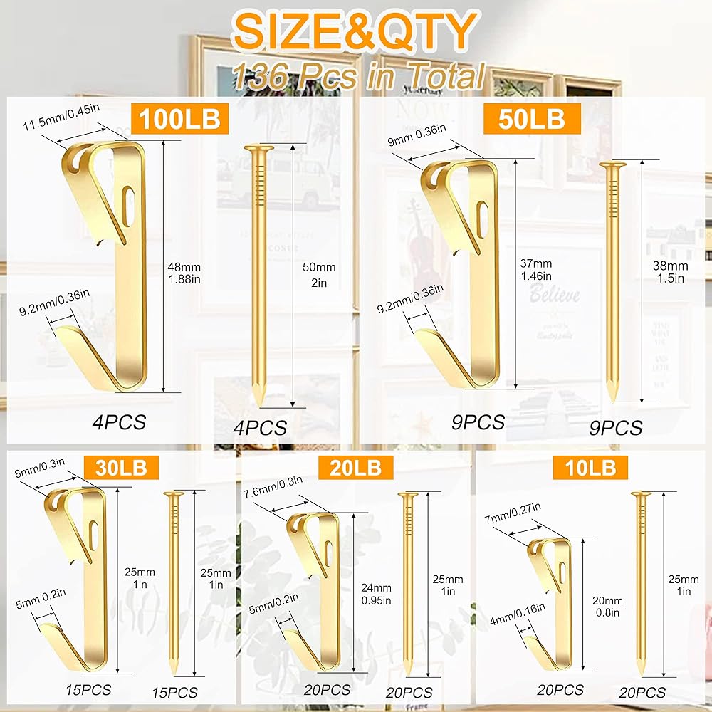 • ⚒️【مجموعة رائعة لتعليق الصور】من السهل أن يكون لديك مجموعة متنوعة من مجموعات تعليق الصور بأحجام متنوعة. سوف تحصل على 5 مقاسات 136 قطعة من شماعات الصور، بما في ذلك 20 مجموعة من 10 رطل، 20 مجموعة من 20 رطل، 15 مجموعة من 30 رطل، 9 مجموعات من 50 رطل، 4 مجموعات من خطافات 100 رطل مع 68 قطعة أظافر وصندوق تخزين جميل.
