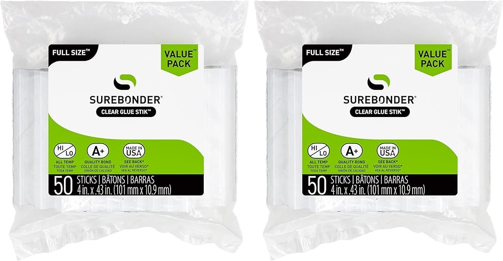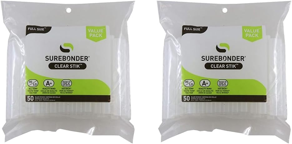 عصي الصمغ Surebonder DT-50 لجميع درجات الحرارة 50 هي مادة لاصقة تذوب ساخنة لجميع درجات الحرارة وتعمل إما في درجة حرارة منخفضة (230 درجة فهرنهايت) أو درجة حرارة عالية (380 درجة فهرنهايت) لمشروعات اللصق اليومية. تستخدم مع مسدسات الغراء ذات درجة الحرارة العالية أو المنخفضة. ترتبط بالمعادن والخشب والورق والنسيج والمغناطيس والسيراميك وأزهار الزهور والزجاج والبلاستيك باستخدام مسدس صمغ بدرجة حرارة عالية. يتم لصقها بالمواد الحساسة مثل البالونات والأشرطة والدانتيل وأعمال الأطفال اليدوية باستخدام مسدس صمغ ذو درجة حرارة منخفضة. لون واضح مع وقت عمل 60-65 ثانية. 7/16 - قطر بطول 10.16 سم. 50 عصا لكل كيس.