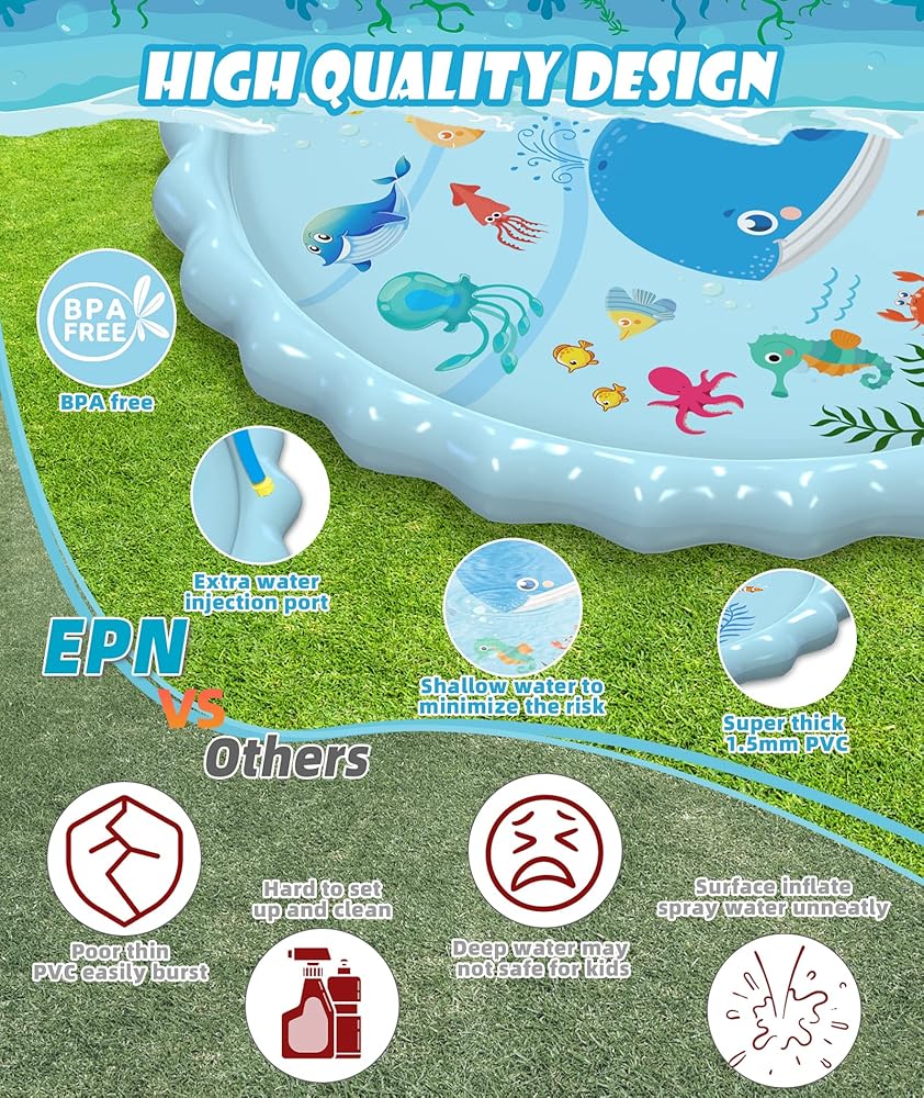 👍التعلم من خلال اللعب - إن وسادات رش EPN للأطفال ليست مجرد لعبة مائية، ولكنها أيضًا حمام سباحة تعليمي ممتع للأطفال. يمكن لأطفالك تعلم الحيوانات البحرية وأشكالها وألوانها أثناء قضاء وقت ممتع، مما يزود طفلك بالتعلم واللعب في حمام سباحة واحد رائع.