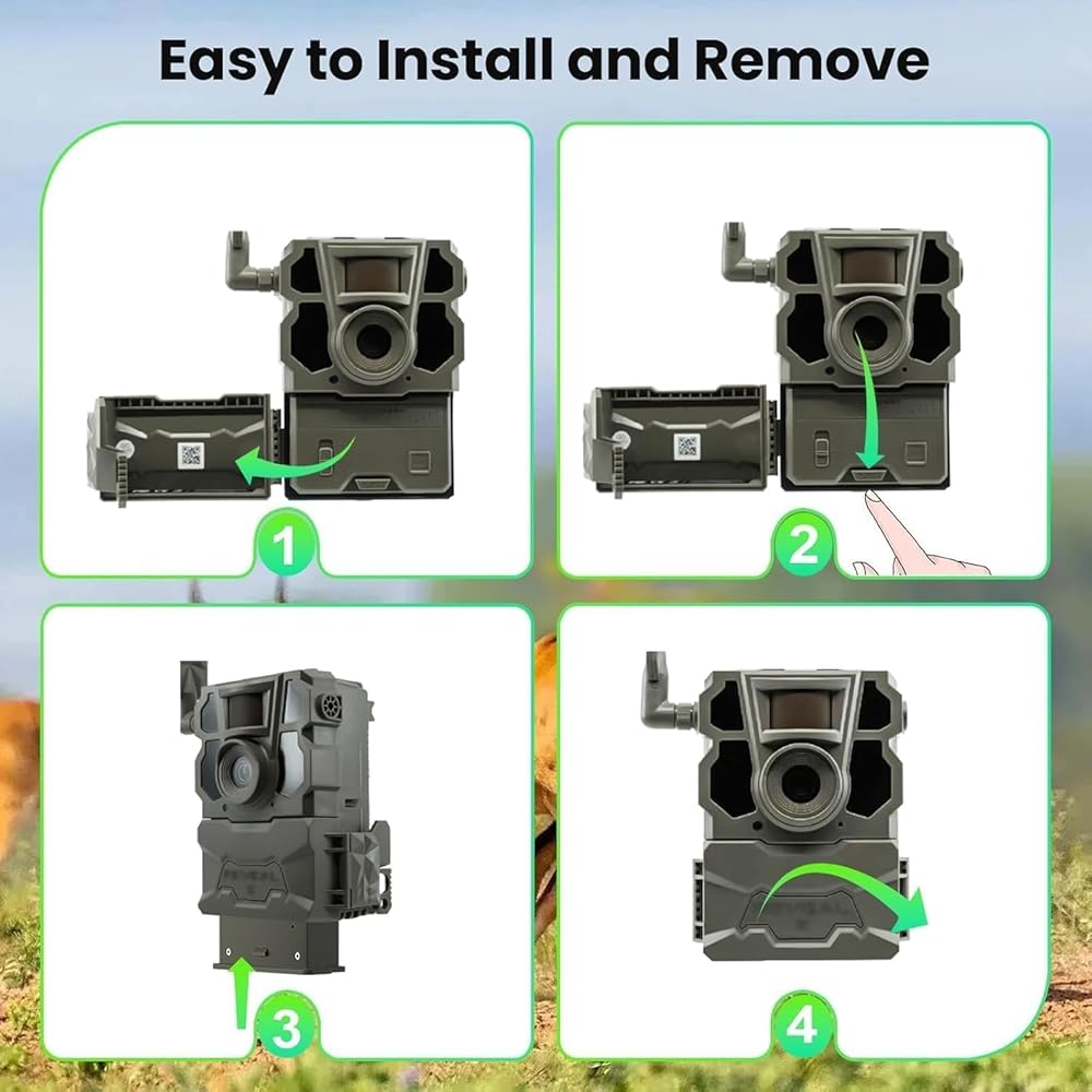 [Easy to Install and Remove] Open the cover of the hunting camera, press the "EJECT" button, then remove the low battery and insert this battery into the battery slot.