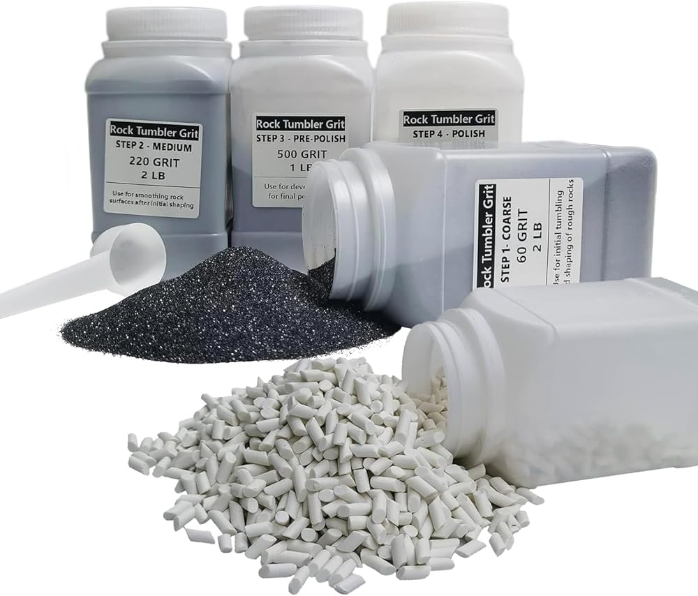 This is a large amount of each size grit for the price. This kit comes with enough grit to complete approximately 16-20 lbs of rocks. This kit contains 2 lbs 60 Coarse Silicon Carbide Grit, 2 lbs 220 Medium Silicon Carbide Grit, 1 lb. 500 Fine Silicone Carbide Grit, 1 lb. 1200 Aluminum Oxide Final Polish Grit. COMPATIBLE WITH ALL BRAND TUMBLERS.