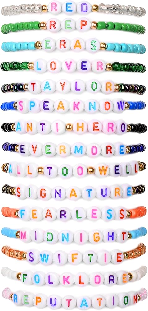 أساور تايلور: تحتوي العبوة الواحدة على 16 قطعة من أساور الصداقة تايلور، مستوحاة من الألبومات الجمالية. أساور عصرية في هذا العام، أساور صداقة رائعة للمعجبين من تايلور.