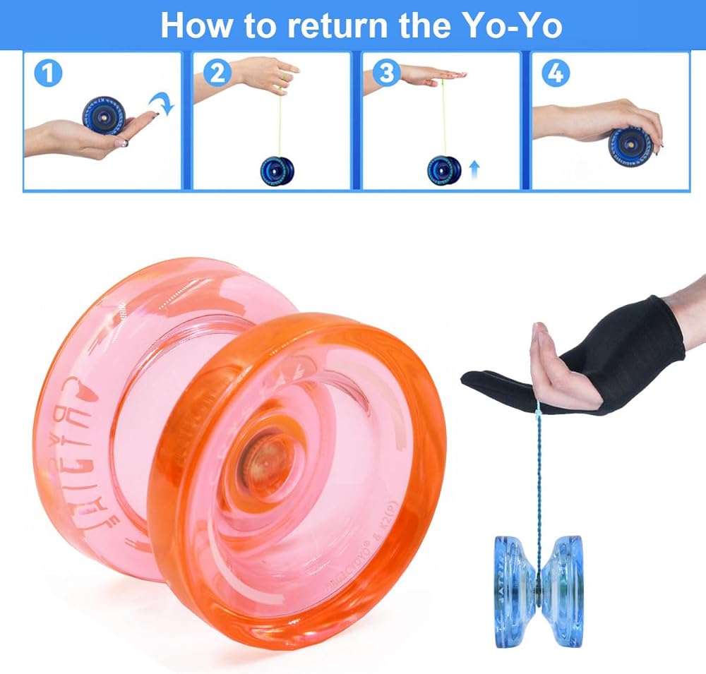 • 5، نصائح اللعب-- 1، أثناء دوران اليويو، سيعود إلى يدك بسحب الخيط بلطف. تم إجراء المزيد من التدريبات، والحصول على حيل أكثر إثارة. 2، إذا لم يعود اليويو بحساسية، فننصح بإضافة القليل من زيت التشحيم أو الزيت المضاد للصدأ إلى المحمل (أضف الزيت بين كرات المحمل)