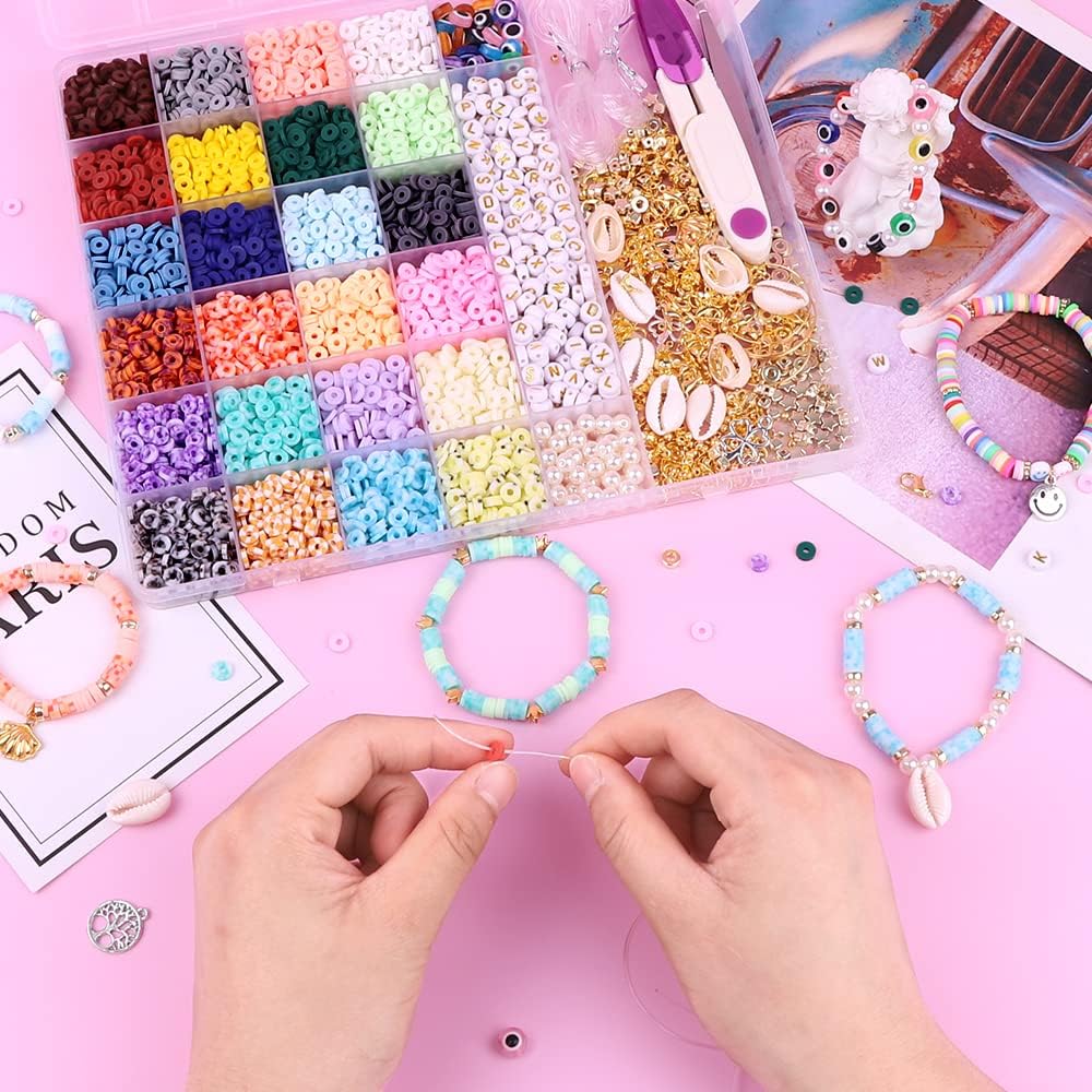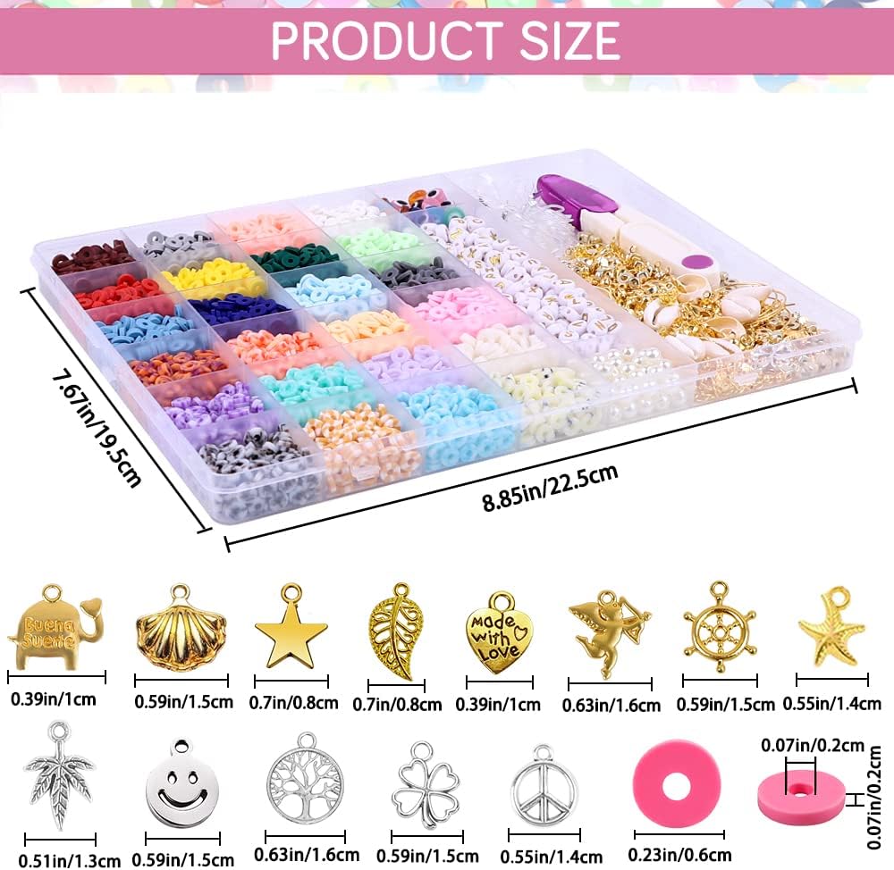 مجموعة صنع الأساور متعددة الاستخدامات: ستحصل على 4000 قطعة من الخرز الطيني في 24 لونًا، 20 قطعة من خرز العين الشريرة، 120 قطعة من خرز الحروف الذهبية، 40 قطعة من خرز اللؤلؤ، 60 قطعة من الخرز الفاصل الذهبي على شكل نجوم، مربعات، مستديرة مسطحة، 10 قطع مشبك سرطان البحر، 30 قطعة من الإبزيم، 50 قطعة من حلقات الوصل، 13 قطعة من حلي الذهب والفضي، 5 قطع صدفة الإعلانات، 3pcs الأذن الأذن 3اكسسوارات الخواتم، 2 لفة من الخيط المرن الكريستالي، زوج من المقصات وزوج من الملاقط، إجمالي 4400 انش، غنية بما يكفي لتلبية جميع احتياجاتك لصنع الأساور وصناعة المجوهرات.