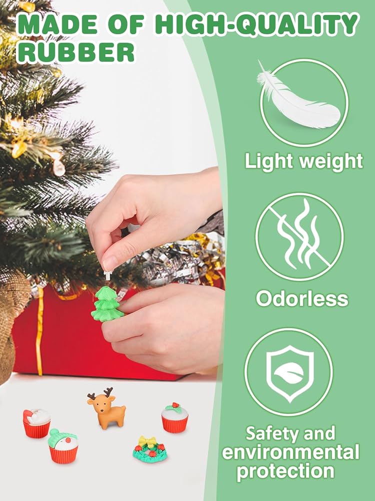 • مادة فاخرة: تتكون مادة ممحاة عيد الميلاد الخاصة بنا من مطاط عالي الجودة، وخفيف الوزن، ولا توجد رائحة نفاذة، والمواد آمنة على البيئة. يمكن لهذه الممحاة إزالة علامات القلم الرصاص بسهولة مع ضغط قليل، ولن تمزق ورقتك، لا اللطخات، لا الظلال.