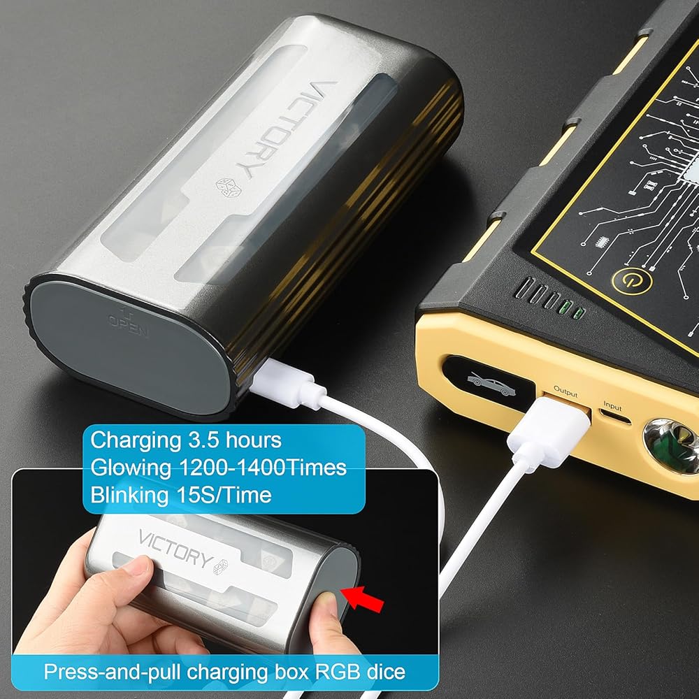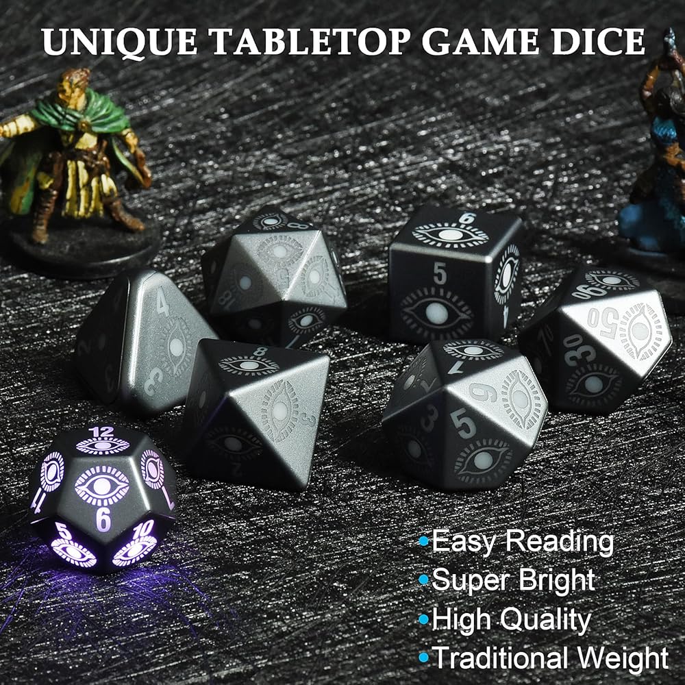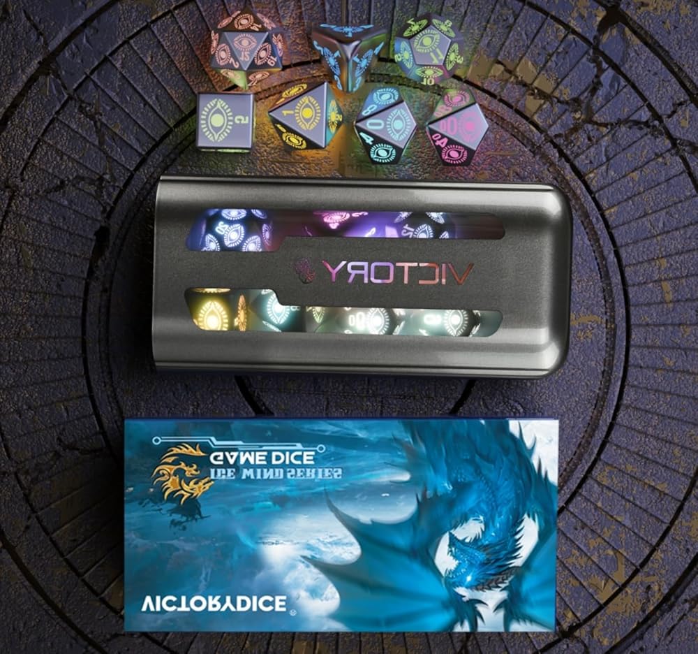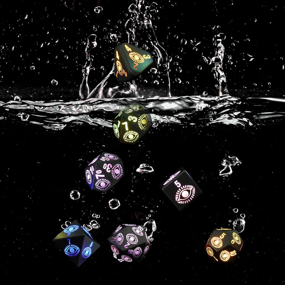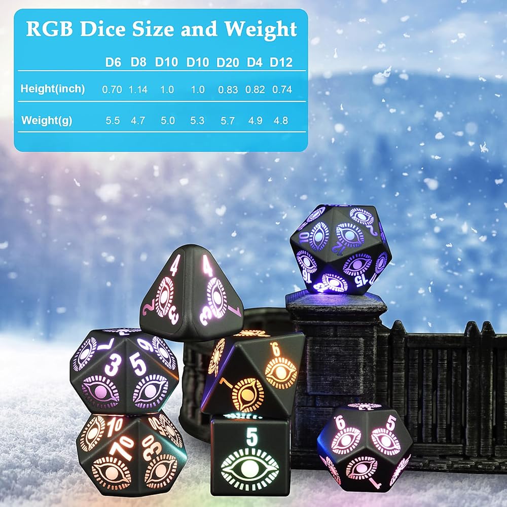 مجموعة نرد D&D المكونة من 7 قطع: مجموعة من 7 نرد DND (1 × D20، 1 × D12، 2 × D10، 1 × D8، 1 × D6، و1 × D4) مما يضمن أنها جاهزة دائمًا للعبتك القادمة. مع وقت شحن يصل إلى 3.5 ساعات، يمكن إضاءته حتى 1200-1500 مرة، مما يسمح بالاستمتاع بالألعاب دون انقطاع.