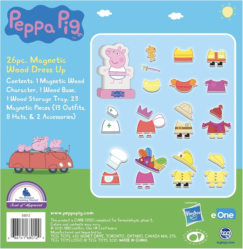 تحب بيبا ارتداء الملابس! مع مجموعة الملابس الخشبية المغناطيسية الممتعة هذه، يمكنك مساعدة بيبا على تجربة الكثير من الأزياء والأزياء المختلفة! تتضمن شخصية بيبا مع حامل خشبي، وصينية تخزين خشبية، و13 ملابس، و8 قبعات وإكسسوارات، مما يخلق الكثير من التشكيلات المرحة! مصنوعة من خشب معتمد من مجلس رعاية الغابات وتتميز بتصميم مكتنز، مثالية للأيدي الصغيرة. تشجع على اللعب الإبداعي والخيالي. مناسبة للأعمار من 3 سنوات فما فوق.