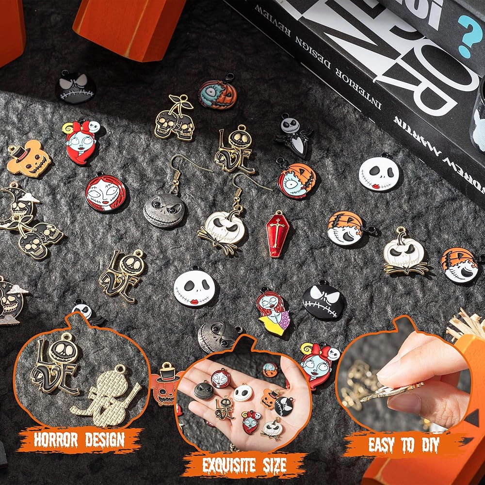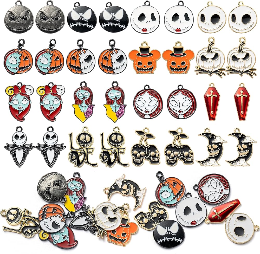 • Horror Design - These jack and sally charms pendants are filled with Halloween and horror elements such as ghost, pumpkin, skeleton, cross coffin, and more. It's time to call up your friends and family to DIY jewelry to add a touch of spooky fun to your party.