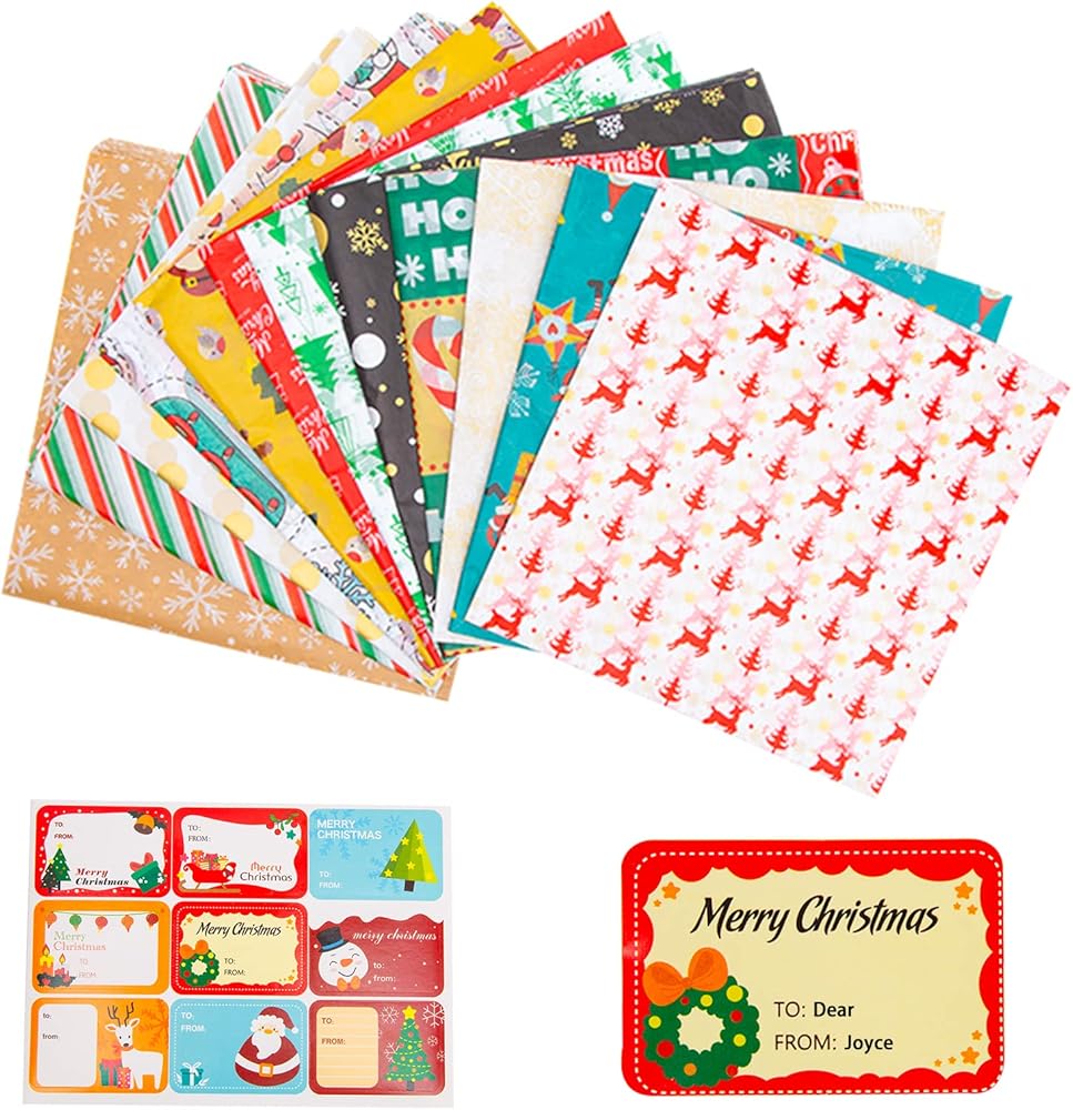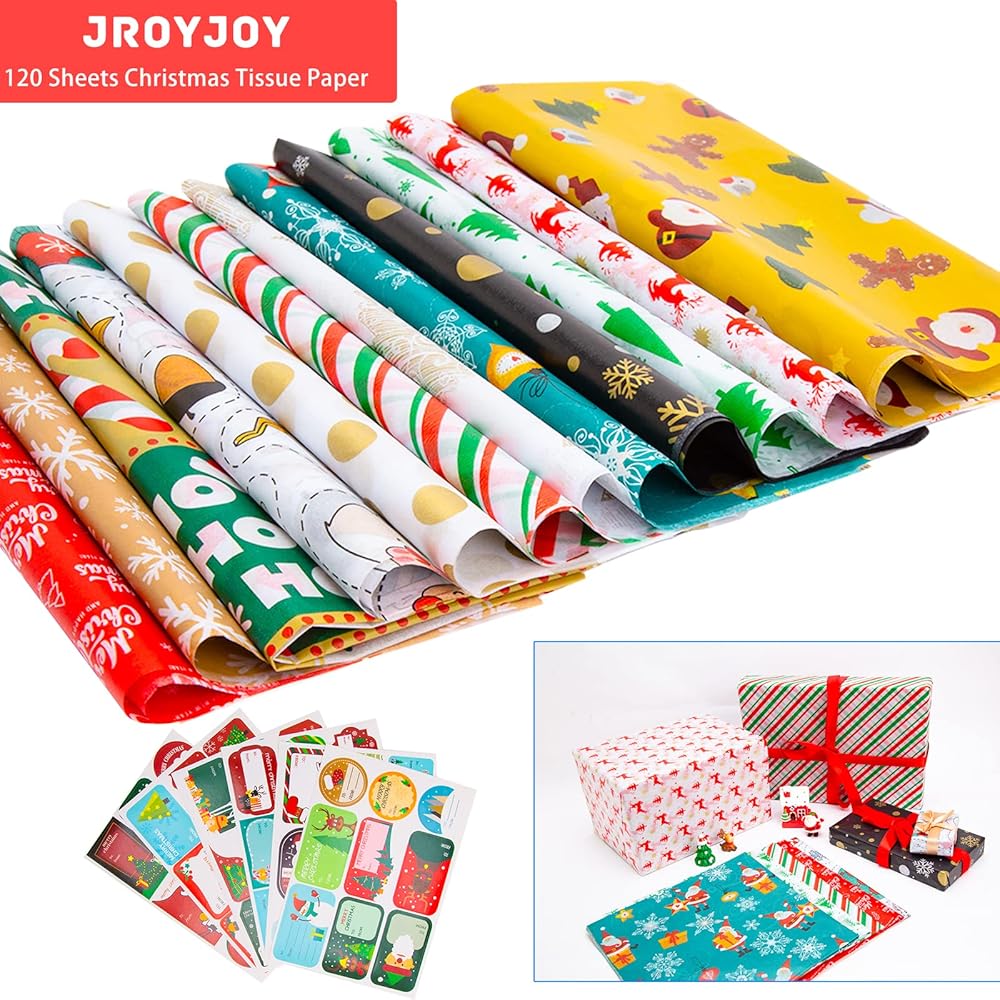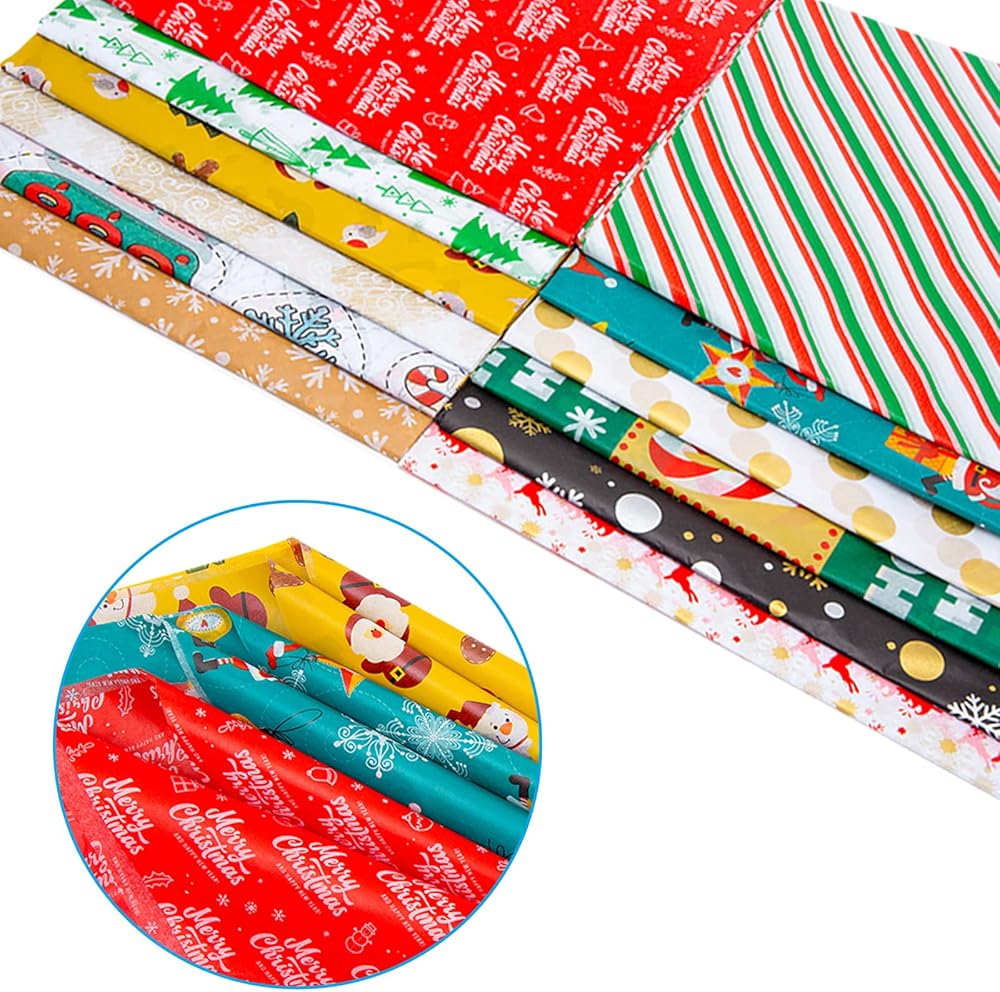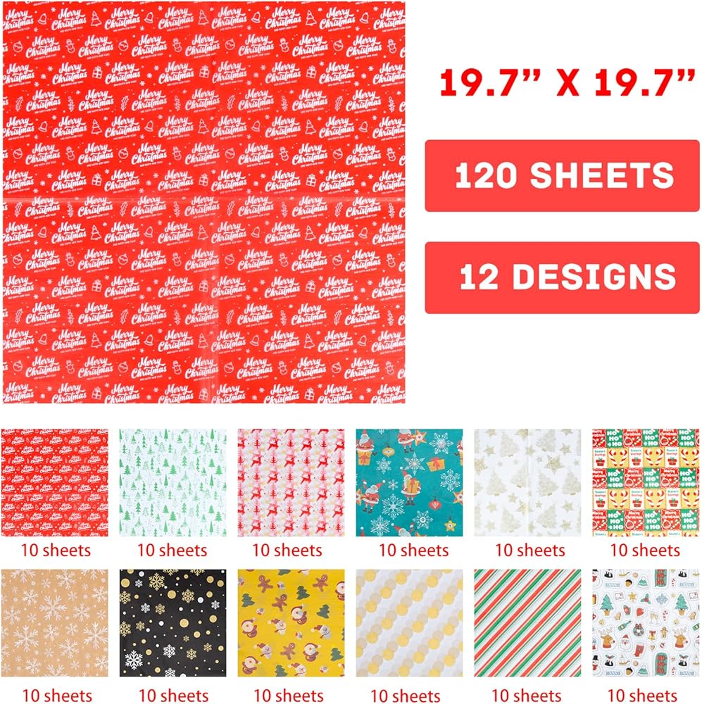 مجموعة مناديل تغليف عيد الميلاد ذات القيمة الفائقة: 120 ورقة من ورق تغليف عيد الميلاد متضمنة تأتي في 12 نمطًا احتفاليًا مختلفًا، مما يسمح لك بتغليف جميع الهدايا الجميلة لأحبائك في عيد الشكر القادم وموسم عيد الميلاد.