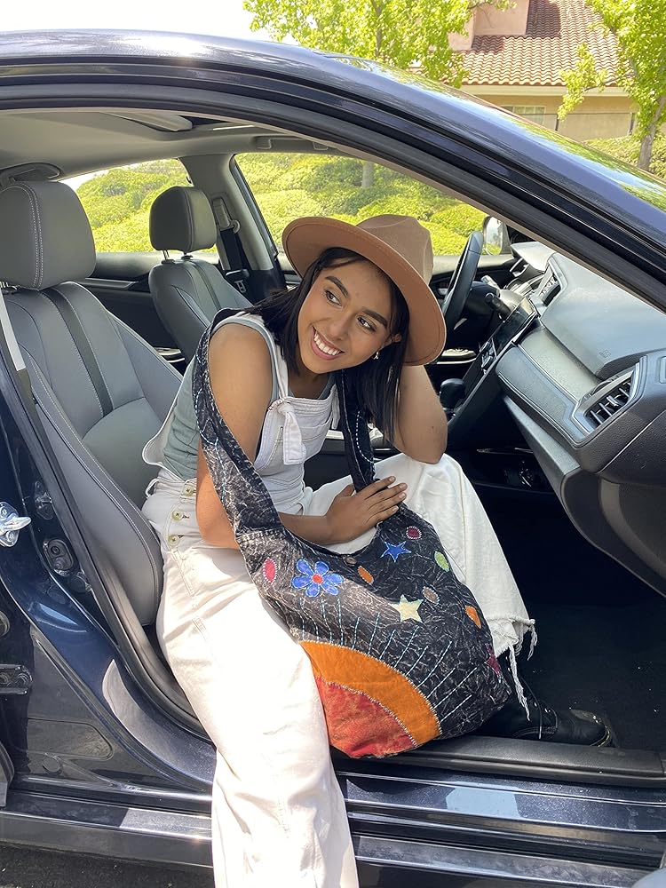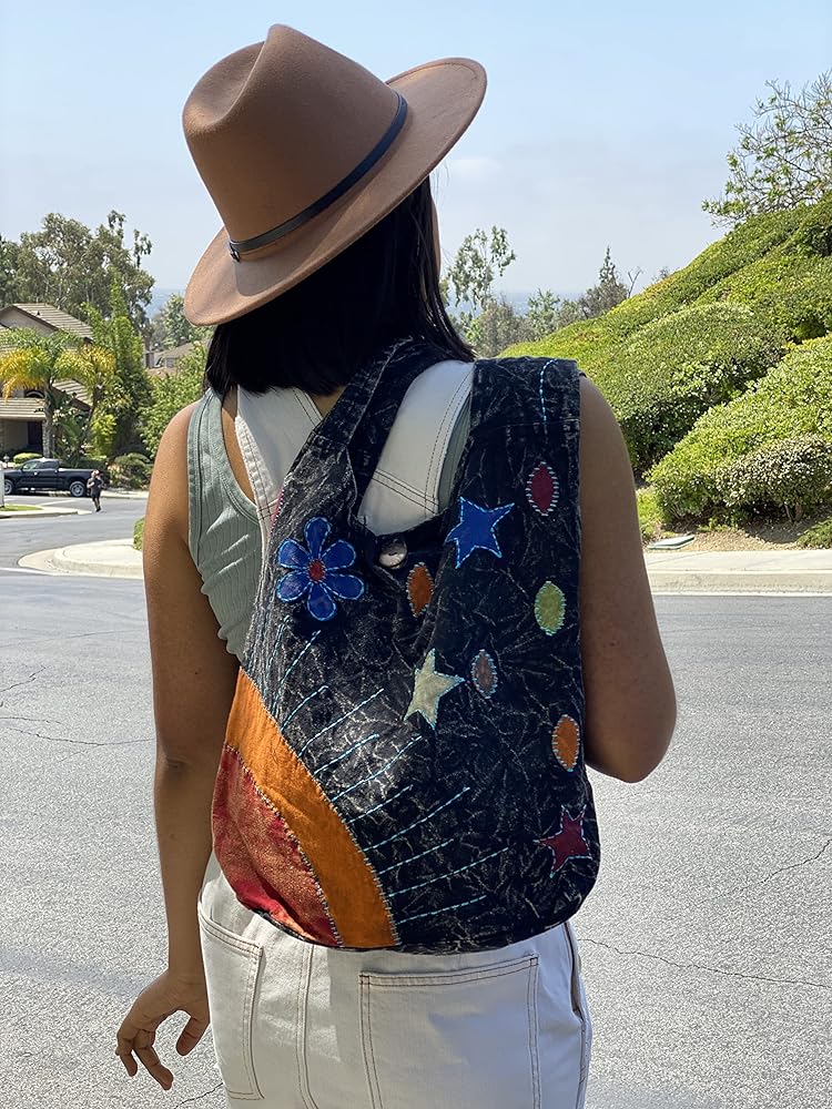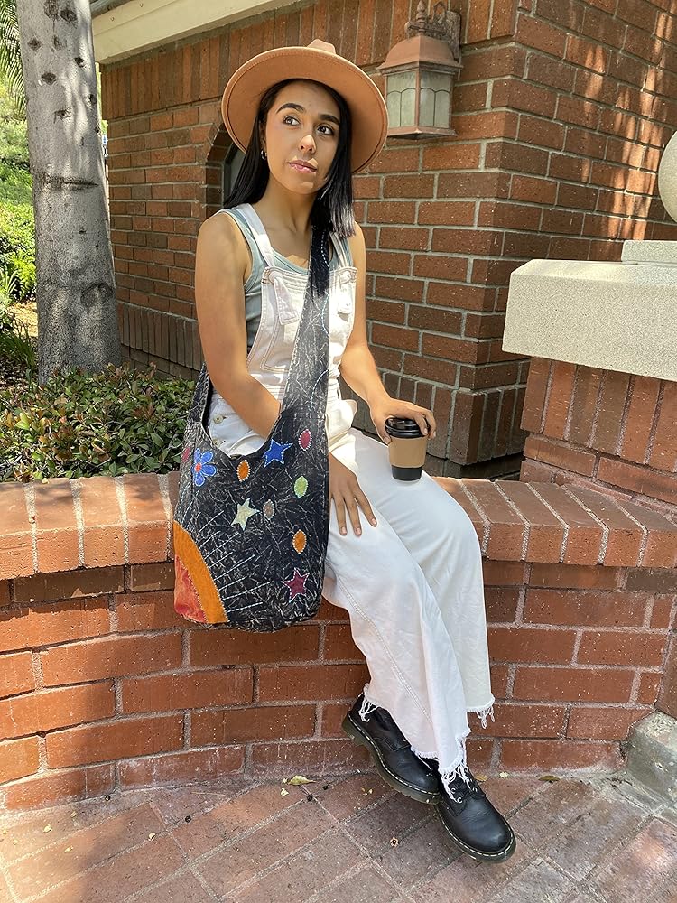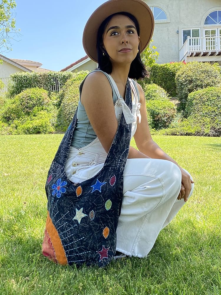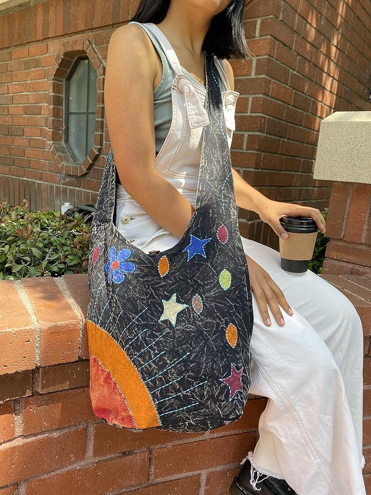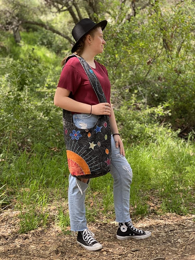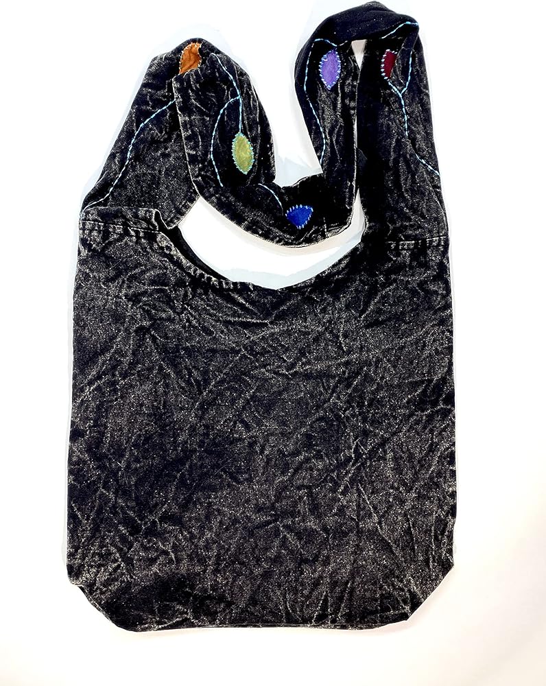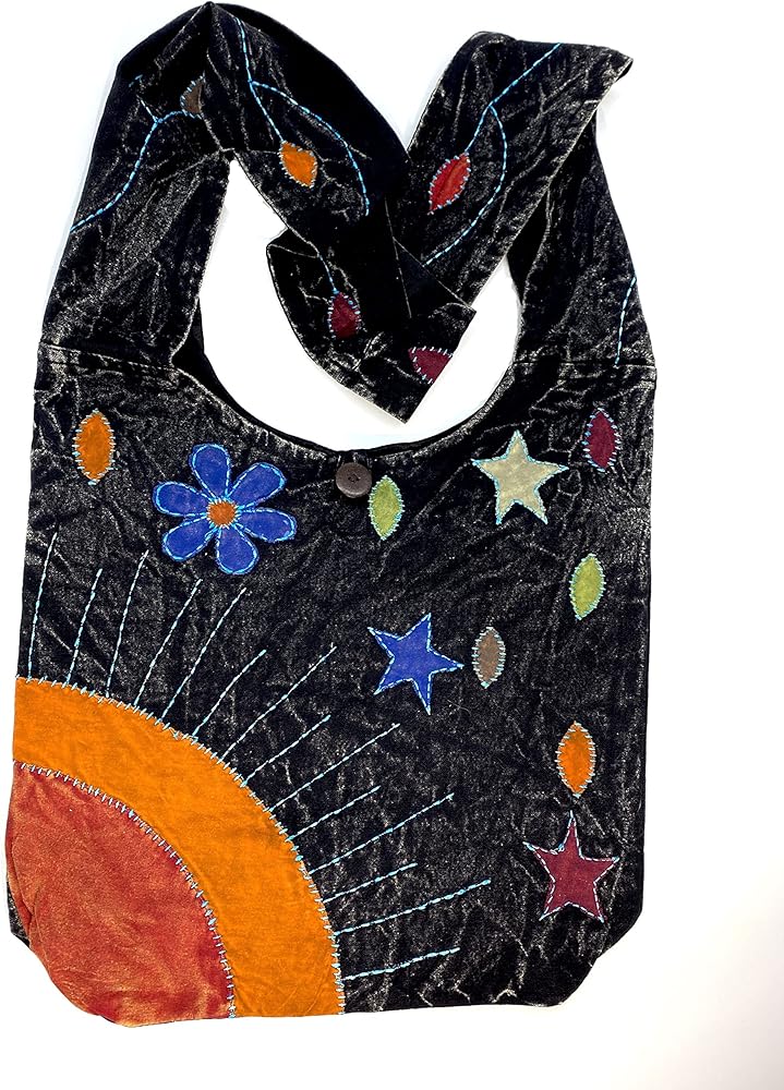 Elements of nature, this stylish stonewashed 100% cotton bag shows off a colorful hand-stitched sun with shooting sunrays, celestial stars and Mother Earth's flowers. Comfortable for everyday wear. Measures 13 inches long by 14.5 inches wide. The strap drops 23 inches from the shoulder to the top of the bag. The width of the strap is a wide 3 inches which helps distribute the weight of the bag and makes it very comfortable to wear. Bag has a zipper and button closure, Inside is a convenient zippered pocket. Each bag is handmade, fairly traded and uniquely hand-crafted by artisans in Nepal.