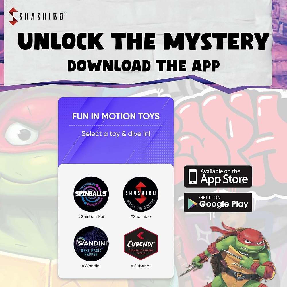 • 2023 باراماونت بيكتشرز. كل الحقوق محفوظة. Nickelodeon وTeenage Mutant Ninja Turtles وجميع العناوين والشعارات والشخصيات ذات الصلة هي علامات تجارية مملوكة لشركة Viacom International Inc.. SHASHIBO وFUN IN MOTION TOYS هي علامات تجارية مسجلة لشركة Spin-Balls, LLC.