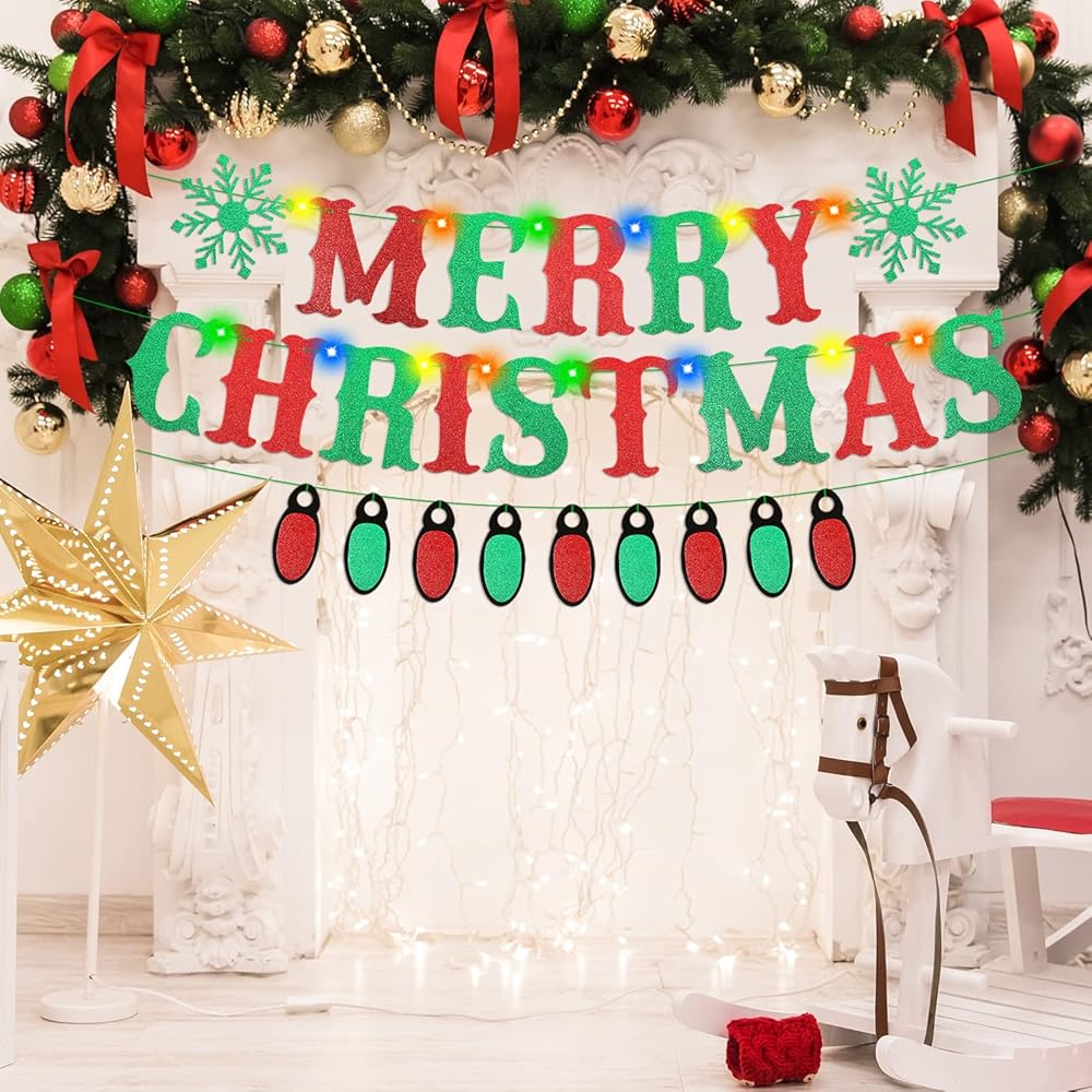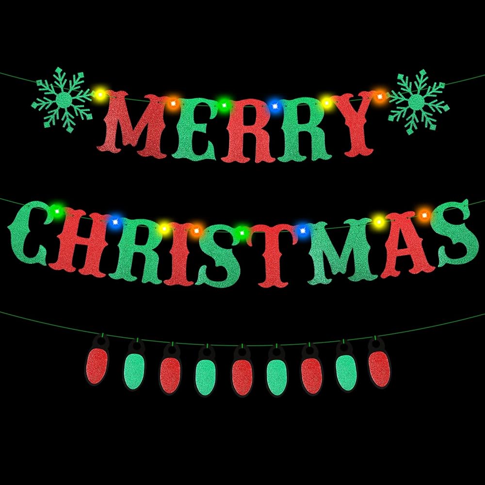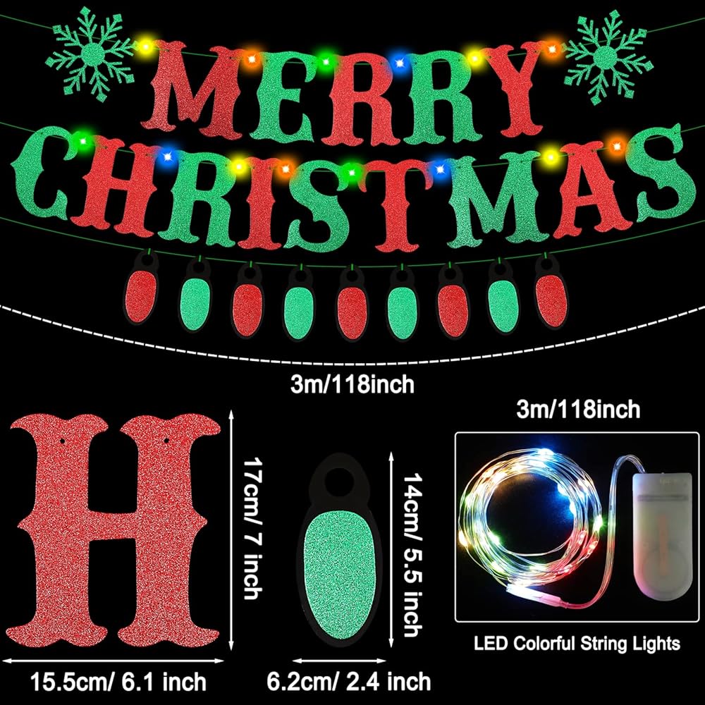 العبوة تشتمل على: 1 قطعة لافتة عيد ميلاد سعيد لامعة باللونين الأحمر والأخضر، 1 قطعة لافتة مصباح لامعة، 1 لفة سلسلة إضاءة LED ملونة تأتي مع بطاريات، مادة لامعة تضيف شعورًا راقيًا إلى حفلة عيد الميلاد، مثالية لتزيين حفلات عيد الميلاد، تستحق الشراء!