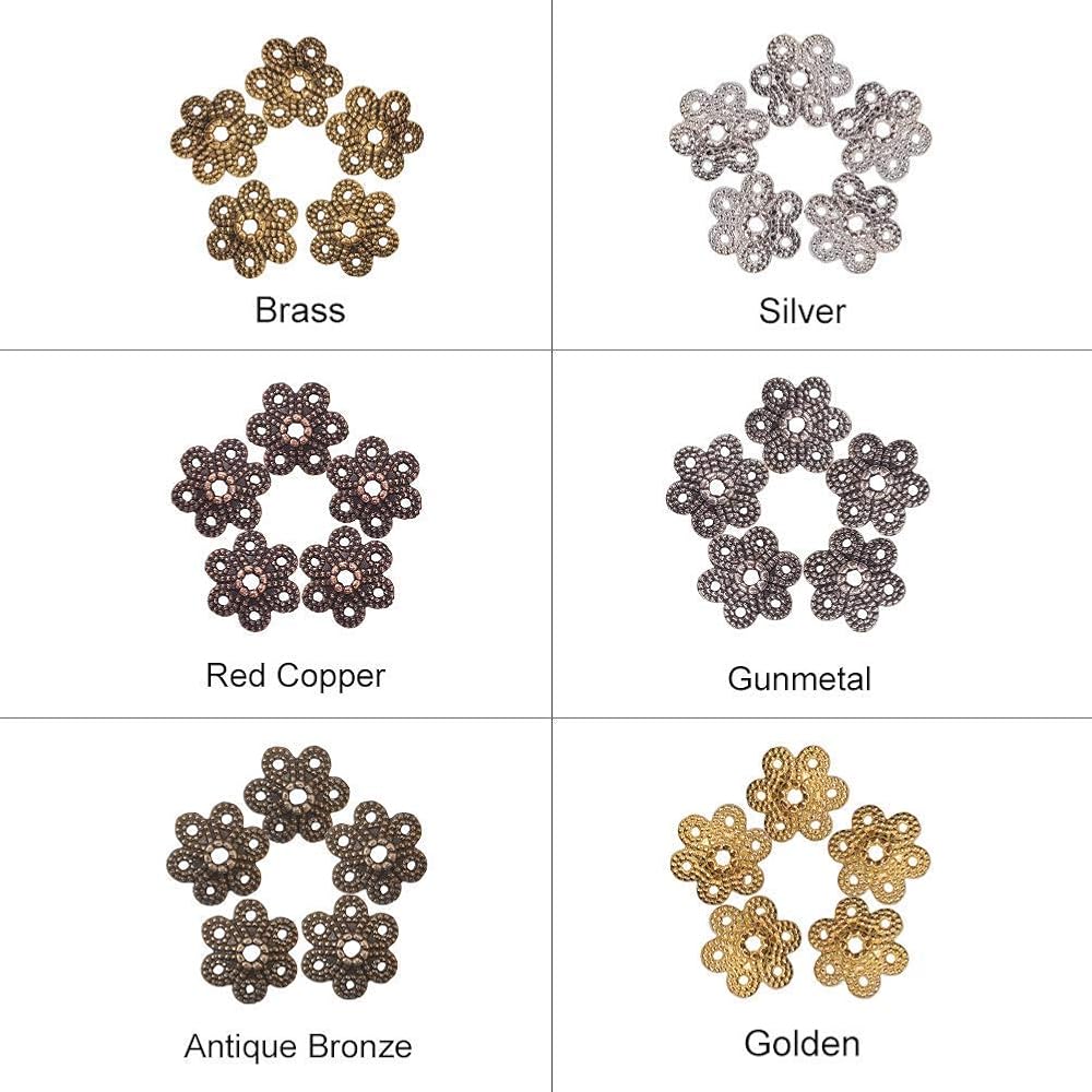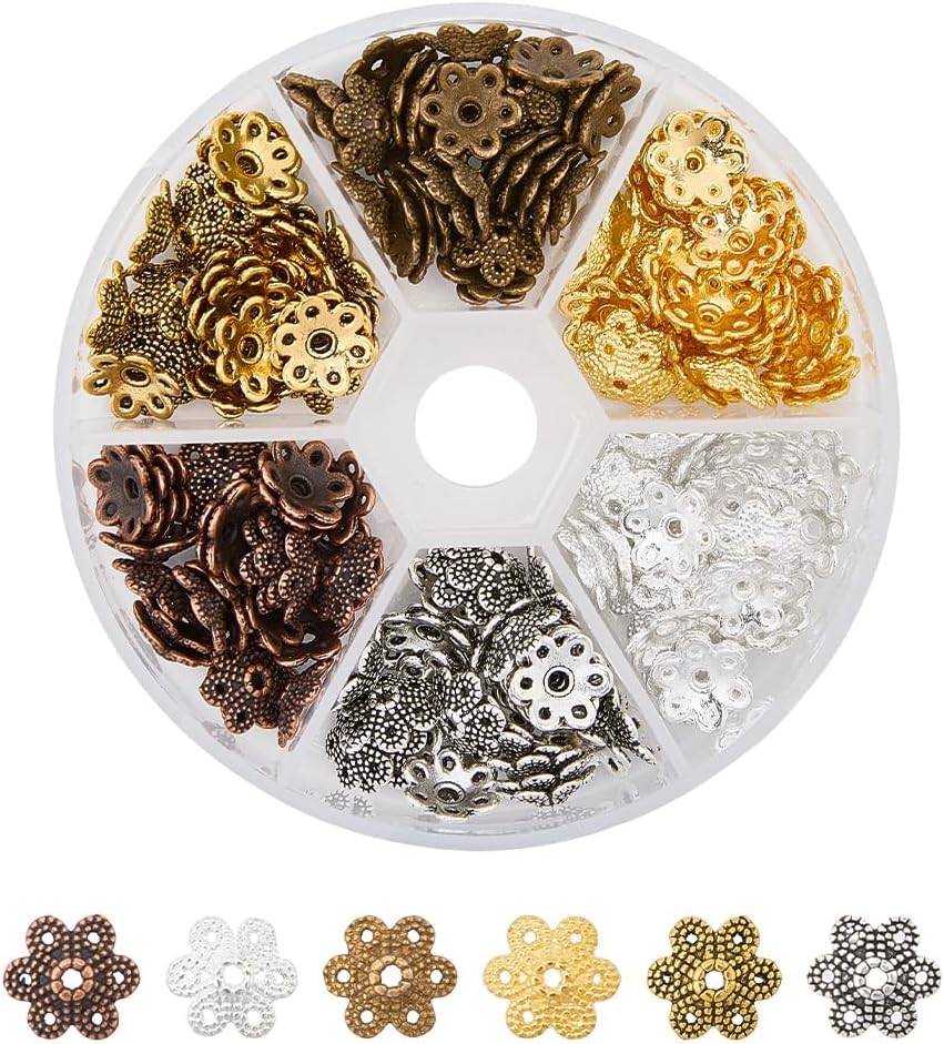 16 غطاء طرفي: تتضمن العبوة 64 قطعة من قبعات الخرز المعدنية على شكل زهرة في 8 أشكال، كل شكل لونين - ذهبي وبلاتيني، إجمالي 16 نمطًا، كل نمط 4 قطع؛ أنماط مختلفة تلبي احتياجاتك المختلفة في مشاريع DIY.