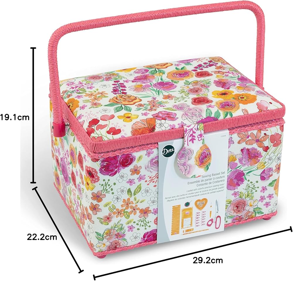 مجموعة سلال الخياطة دريتز عالية الجودة هذه مليئة بأدوات خياطة بألوان زاهية! تتناسق الأدوات ذات اللون البرتقالي والوردي الجريء مع طباعة الزهور الملونة والجزء الداخلي الزهري الزاهي. أدوات الخياطة المتضمنة هي المجموعة المثالية للخبراء والمبتدئين. تشتمل المجموعة على مقصات قص القماش، وحامل دبوس مغناطيسي مع دبابيس رأس زجاجية مقاومة للحرارة (لن تذوب عند الكي)، أداة تقطيع خياطة بشفرة صغيرة حادة، إبر يدوية، مشابك صغيرة لحمل طبقات متعددة من القماش معًا، وشريط قياس، ومسطرة، وقلم تحديد ووسادة دبوس طماطم لطيفة بحجم "الكرز".