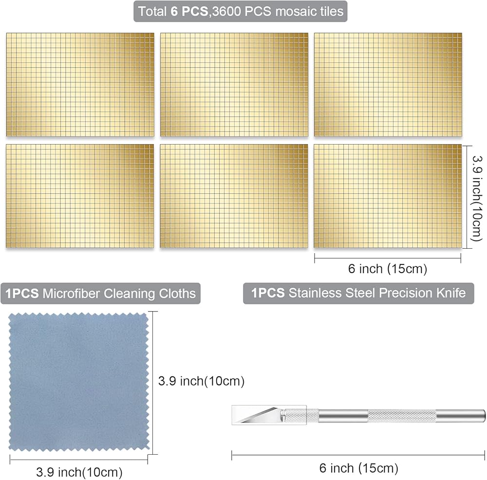 【المادة والمقاس】 مصنوعة من مرايا زجاجية حقيقية. يبلغ حجم كل بلاط صغير حوالي 0.5 × 0.5 سم/ 0.2 × 0.2 بوصة، مقاس ورقة فسيفساء المرآة حوالي 15 × 10 سم/ 5.9 × 3.9 بوصة. حجم السكين هو: 5.7 بوصة. حجم قطعة قماش التنظيف 4 × 4 بوصة.